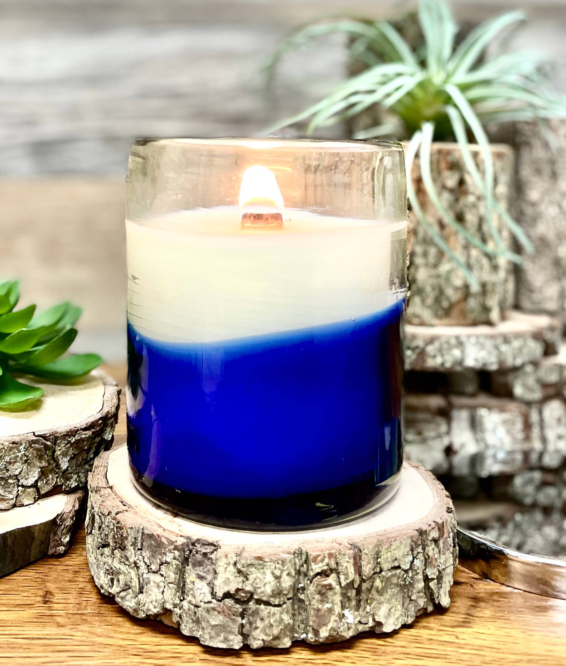 Our cobalt-infused glass vessels hold 8 ounces of our premium soy blend wax mixed with essential oils and quality fragrances. Each candle is unique, as it is artisan crafted by hand, so their size and shape may differ slightly. The glass is made from recycled materials, making our candles an eco-friendly choice. The mirrored silver lid and crackling wood wick exude an air of sophistication, and once the candle burns out, the glass vessel can be repurposed into a drinking glass. We recommend hand washing the glass. Approx. Size 3.9" X 3.1"