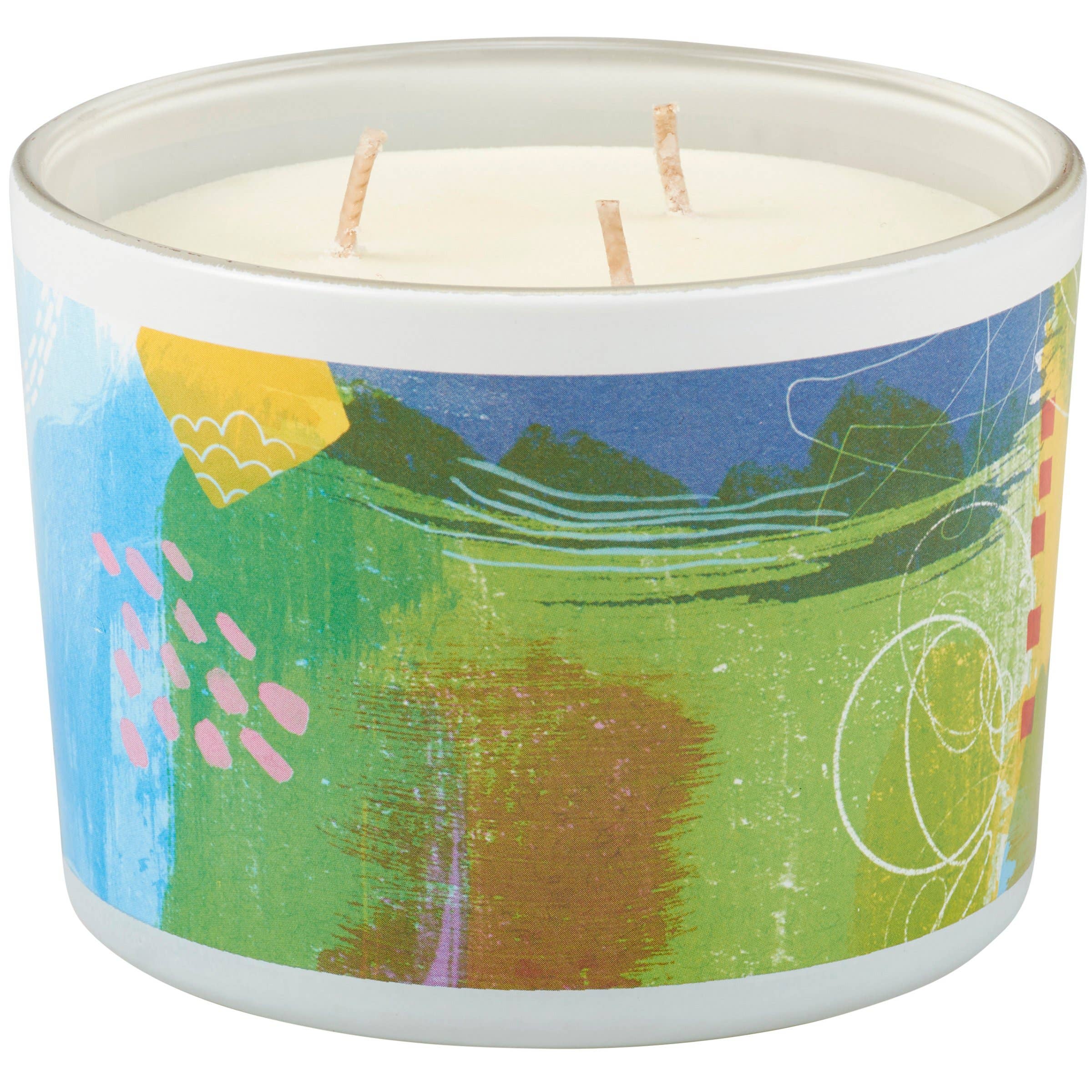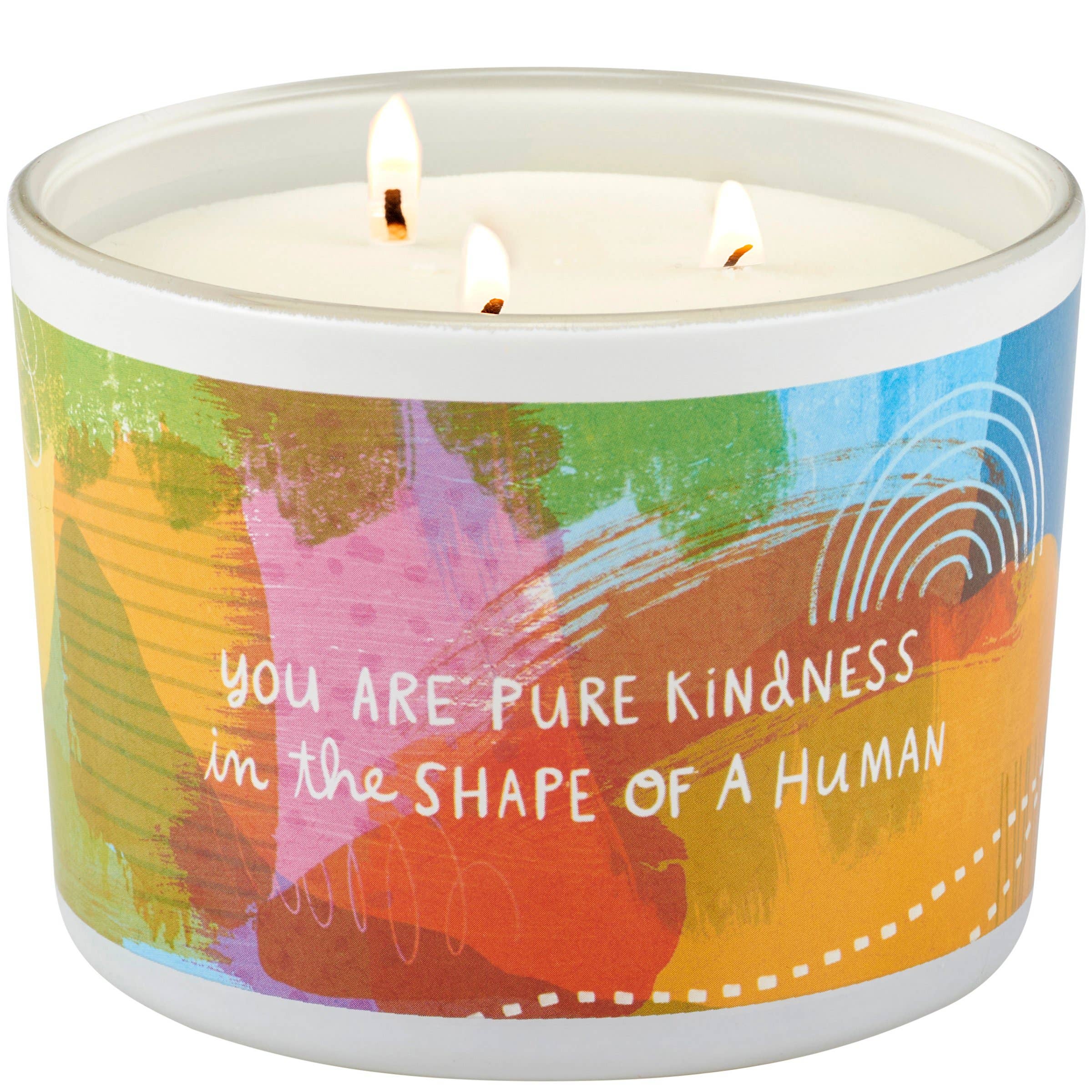 A jar candle from our Inspiration & Blooms Collection displaying a full wrap-around design of hand illustrated abstract art in a warm color palette on frosted white glass with heart-warming sentiment that reads "You Are Pure Kindness In The Shape Of A Human." Candle features soy-based wax and 3 fabric wicks with 30 hours of burn time activating a calming Vanilla scent. Our Pure Kindness jar candle includes a dust cover and plastic lid for protection and polished appearance. An inspirational gift perfect for an everyday home accent.