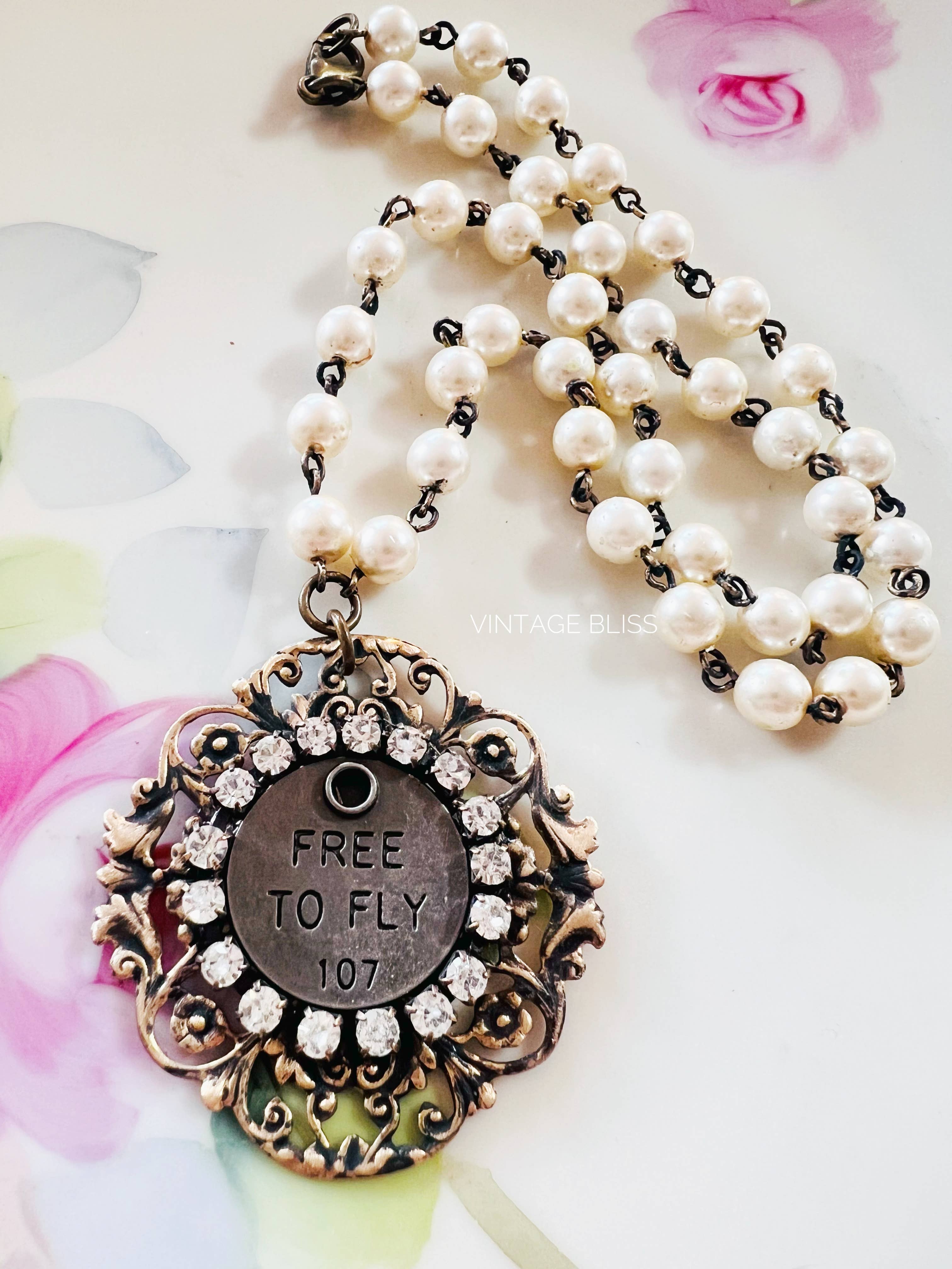 Free To Fly metal tag attached to a brass patina filigree finding surrounded by clear crystal rhinestone chain
