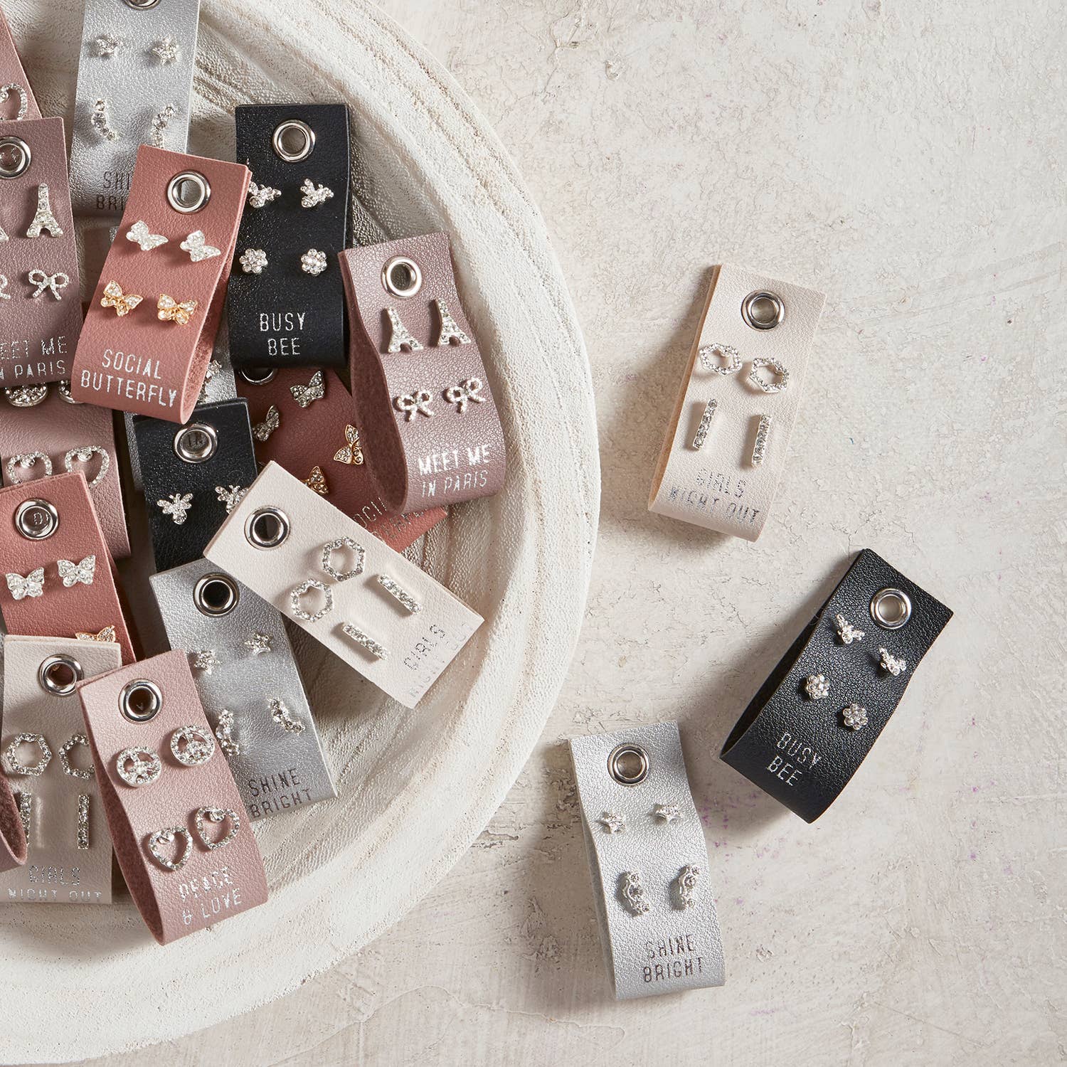 Our best selling leather tag earrings now with double the fun! Includes 2 sets of earrings on a vegan leather tag! · Material: Zinc Alloy/Iron/Rhinestone/PU Leather · Size: 1" L x 2.5" W · Care Instructions: Spot Clean Only