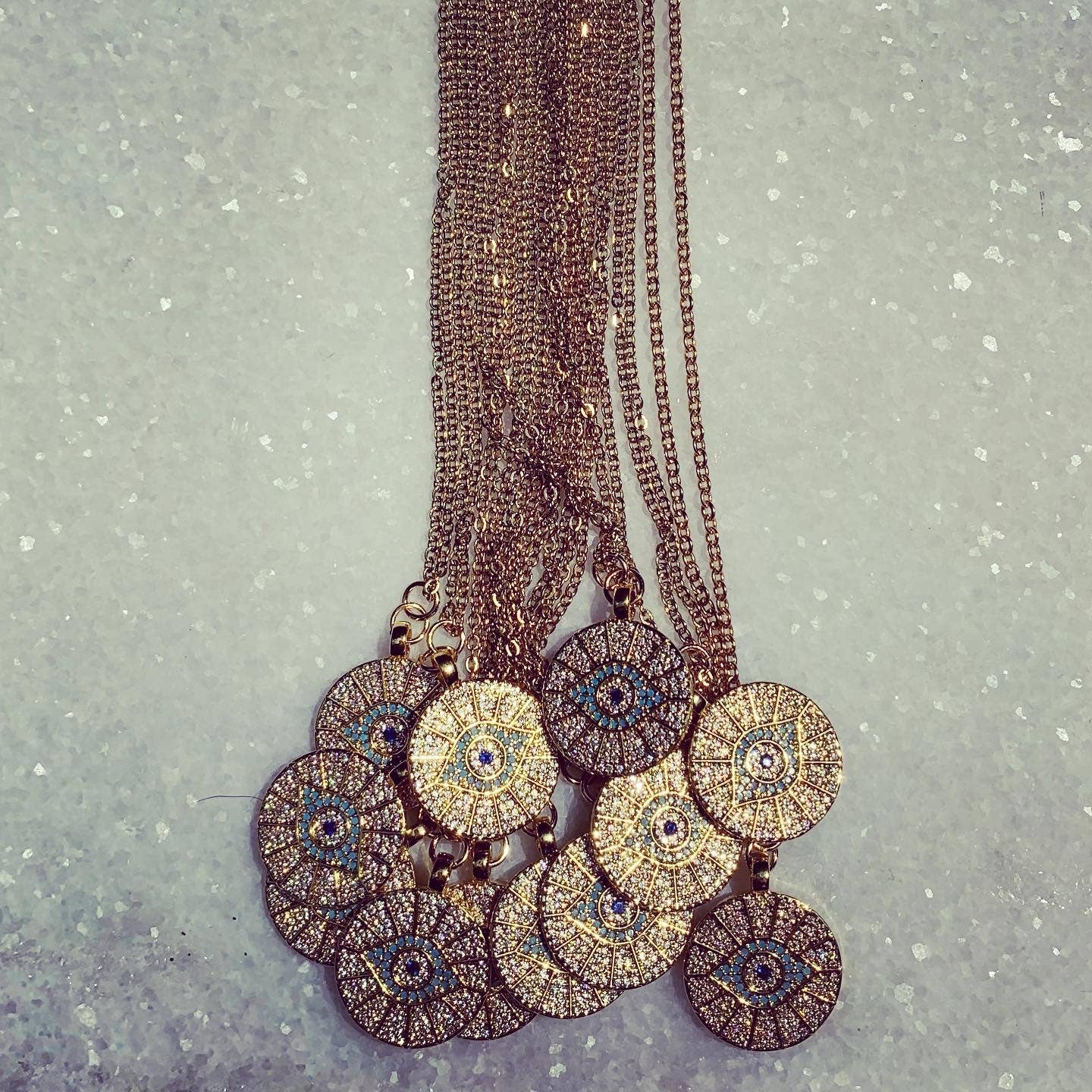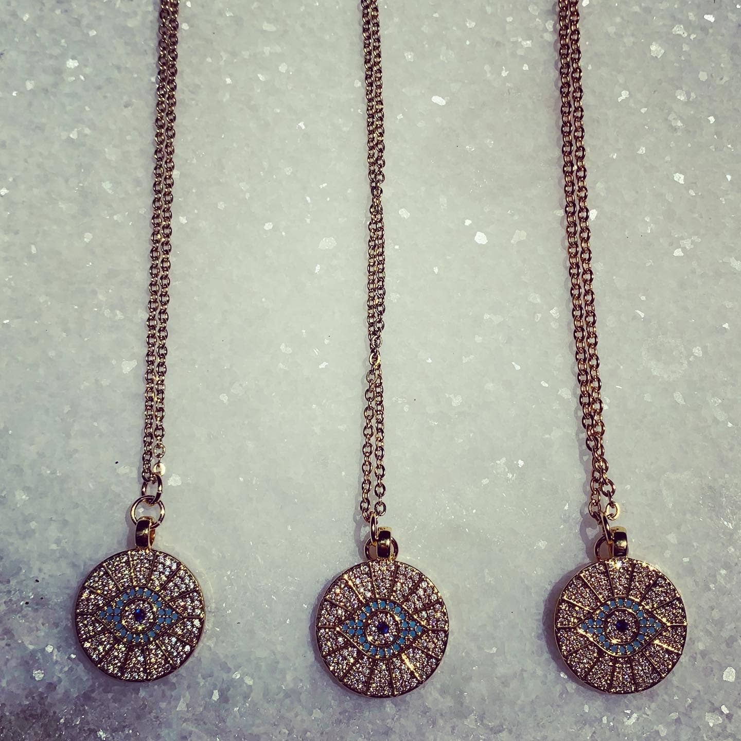 The Eyes Have It is a dainty 22” chain with a clear and blue micro pave covered eye medallion that is 27mm just bigger than a quarter. Great piece to add some layers