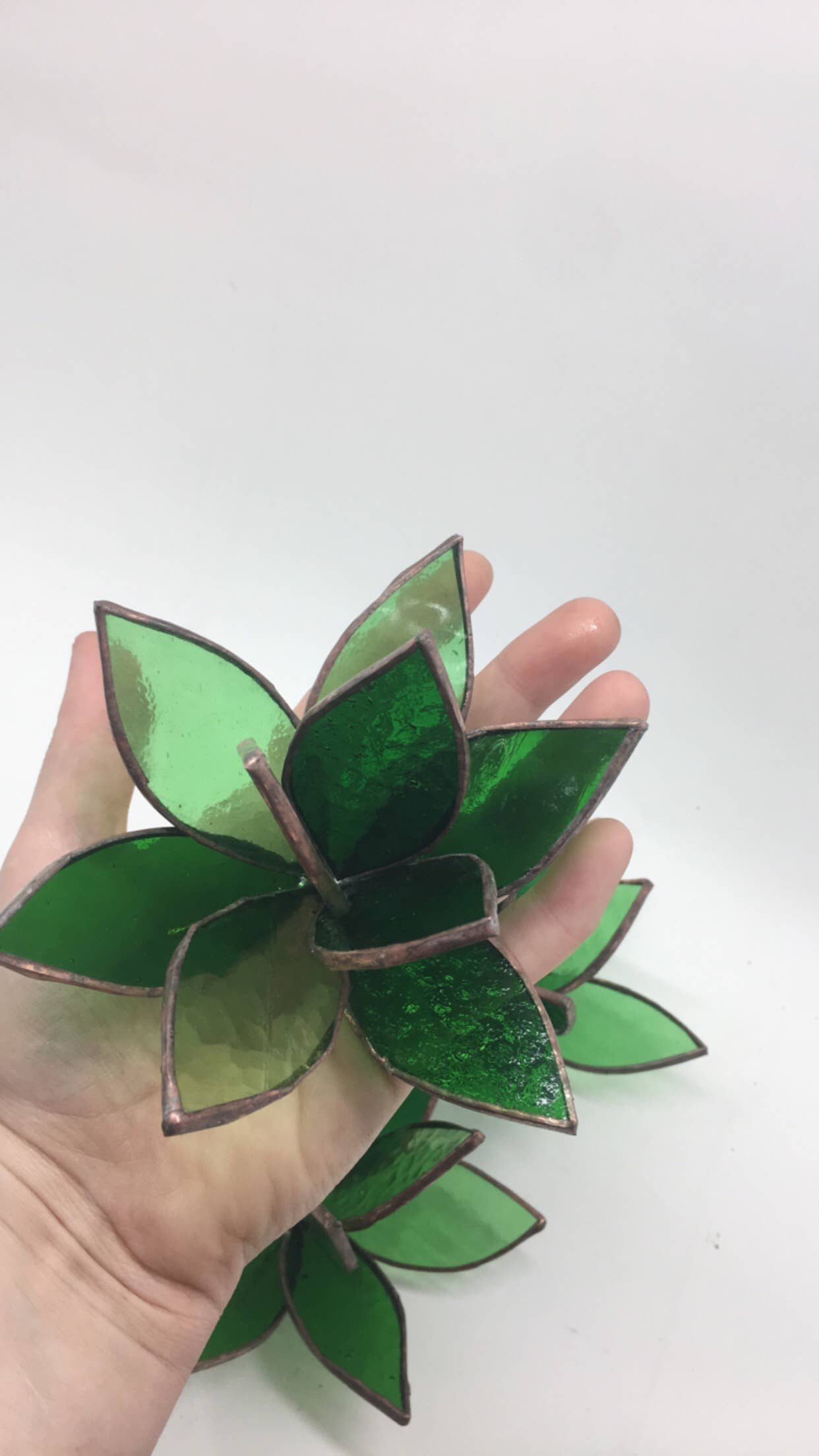 Inspired by the outdoors, my Art Glass Succulent Sculptures are perfectly unique. I'm introducing a plant that can't be killed, because (let's face it) not everyone has a green thumb! Glass may vary from the pictures provided. I always assemble these succulents using two varying textured green art glasses. They measure approximately 4” wide by 5” tall. I’ve attached adjustable copper legs to the bottom so they are free-standing. They look great on their own, but even more fabulous in pots or paired with other plants, whether glass or live. Llead-based solder. Please handle carefully. Keep out of reach of children.