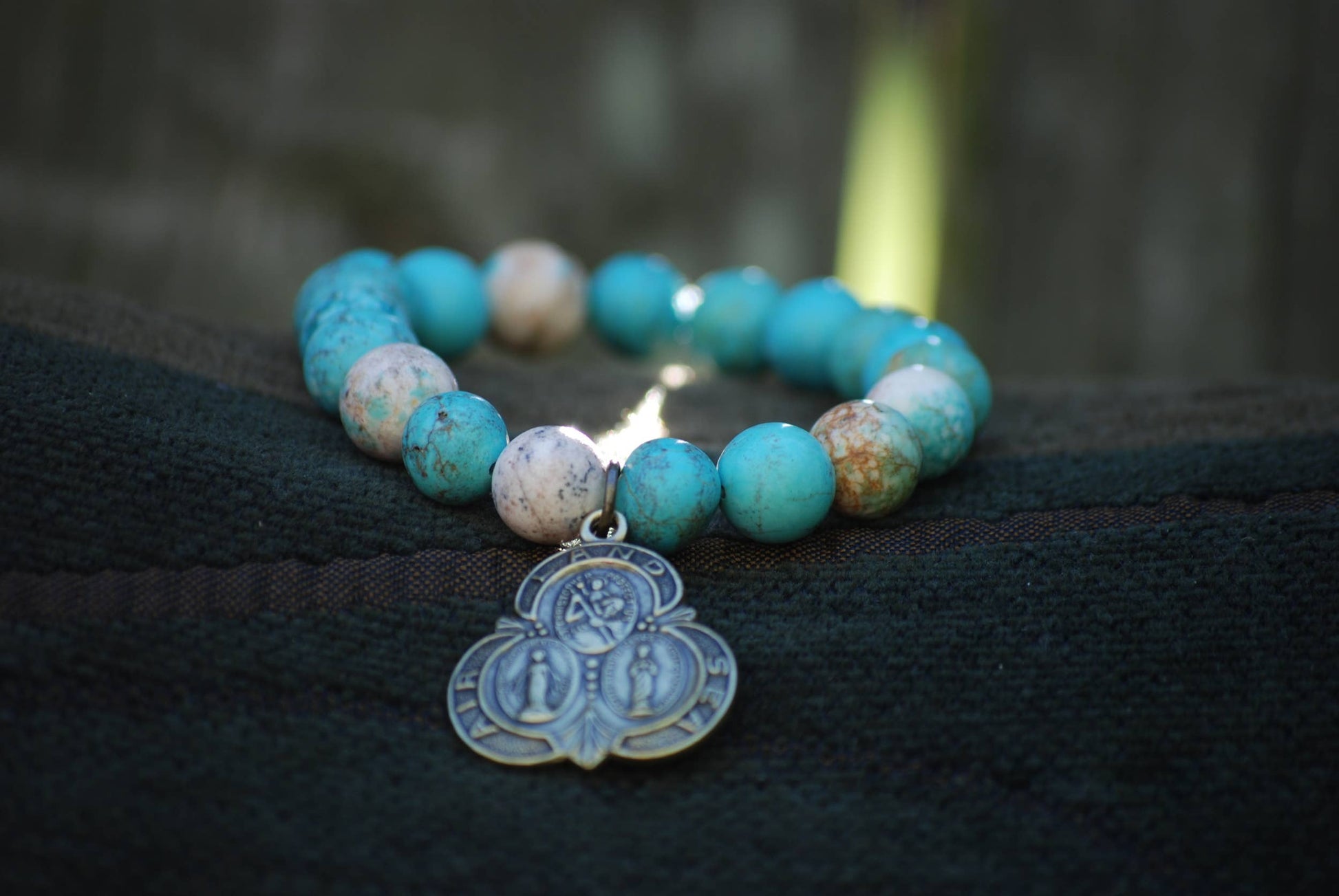 Antique silver or brass travel medal on white and torquoise 10mm magnesite stretch bracelet *shown in brass