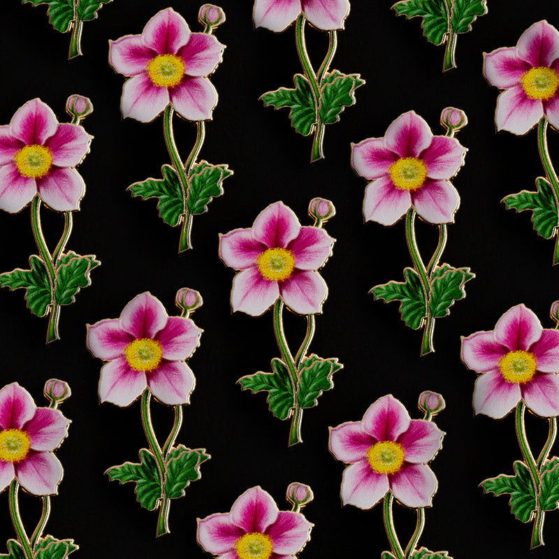 – Detailed UV printed enamel pin showcasing a beautiful Anemone flower design