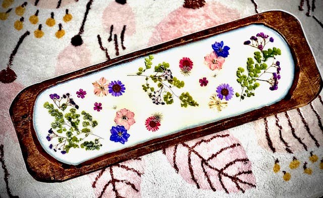 100% American farm grown soy wax infused with our signature essential oil-based LAVENDER fragrance and hand-poured into hand-carved wood bread bowl with 3 cotton lead free wicks and accented with reel pressed flowers. No artifical dyes or toxic chemicals used. Measures approximately 20x6x3