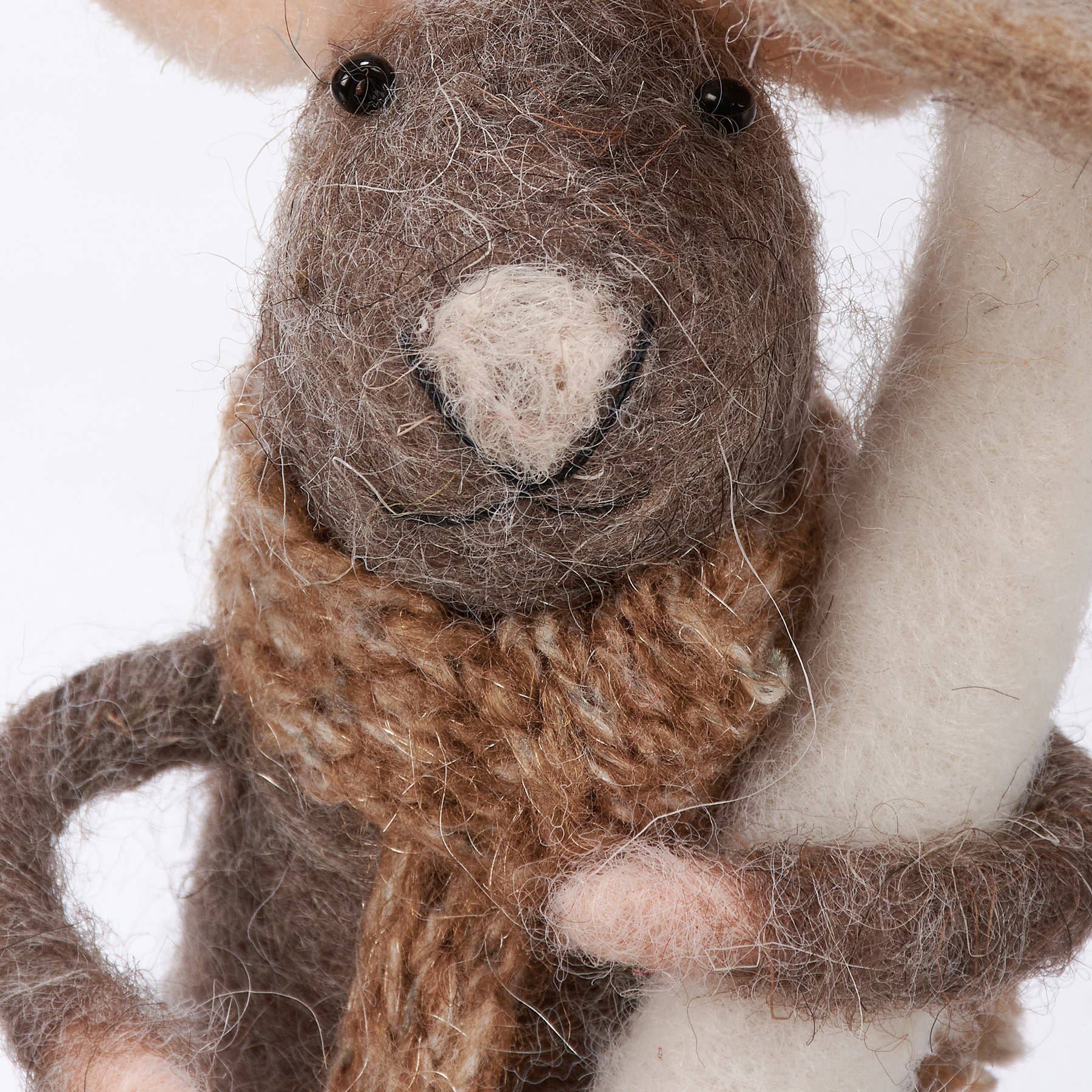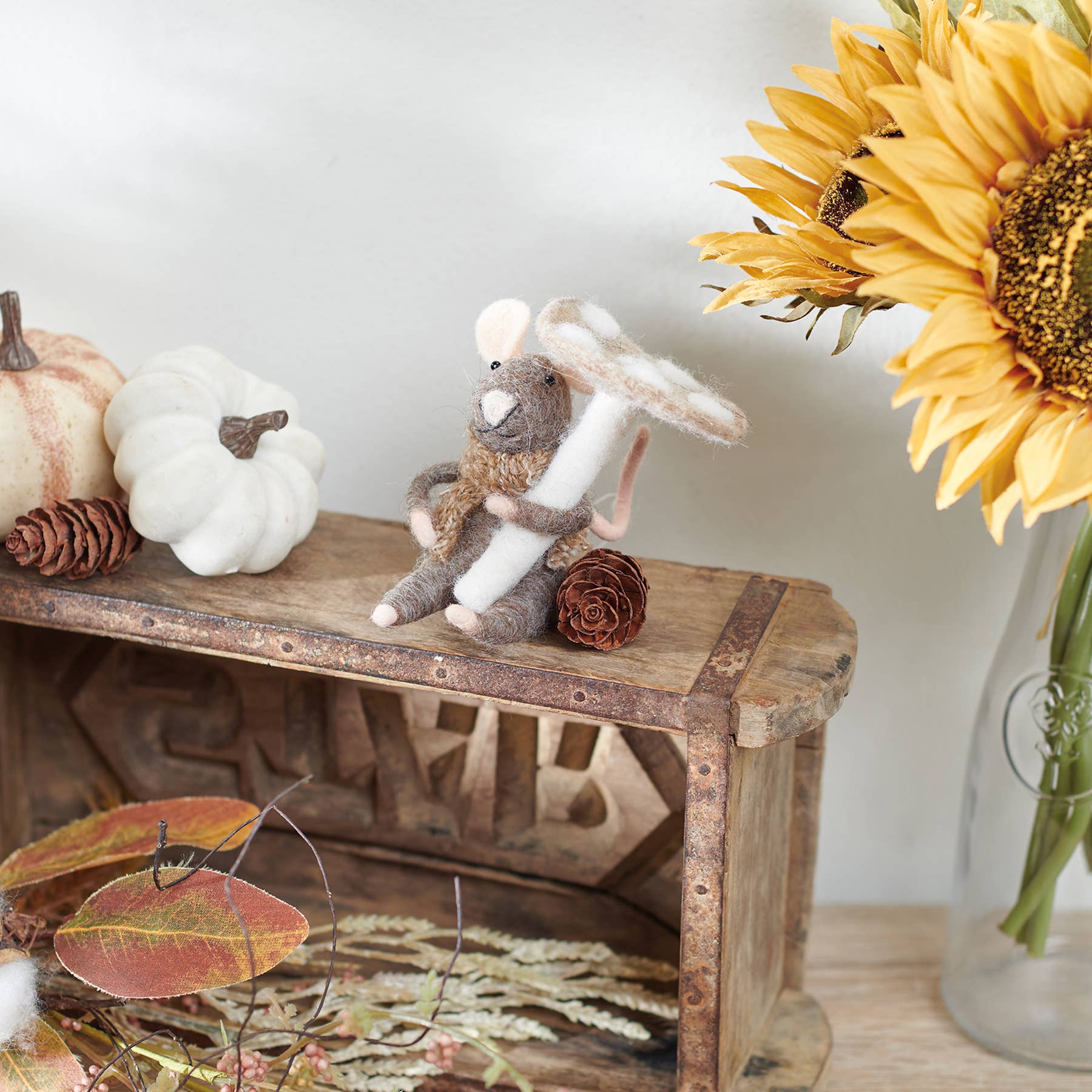 A felt mouse that coordinates well with cottagecore décor and other felt critters from our Fall & Harvest Collection. Mouse features scarf detail and holds a felt mushroom for added interest. Our brown Mushroom Mouse critter is designed to free-stand alone in sitting position. WARNING: CHOKING HAZARD - Contains small parts. This is not a toy.
