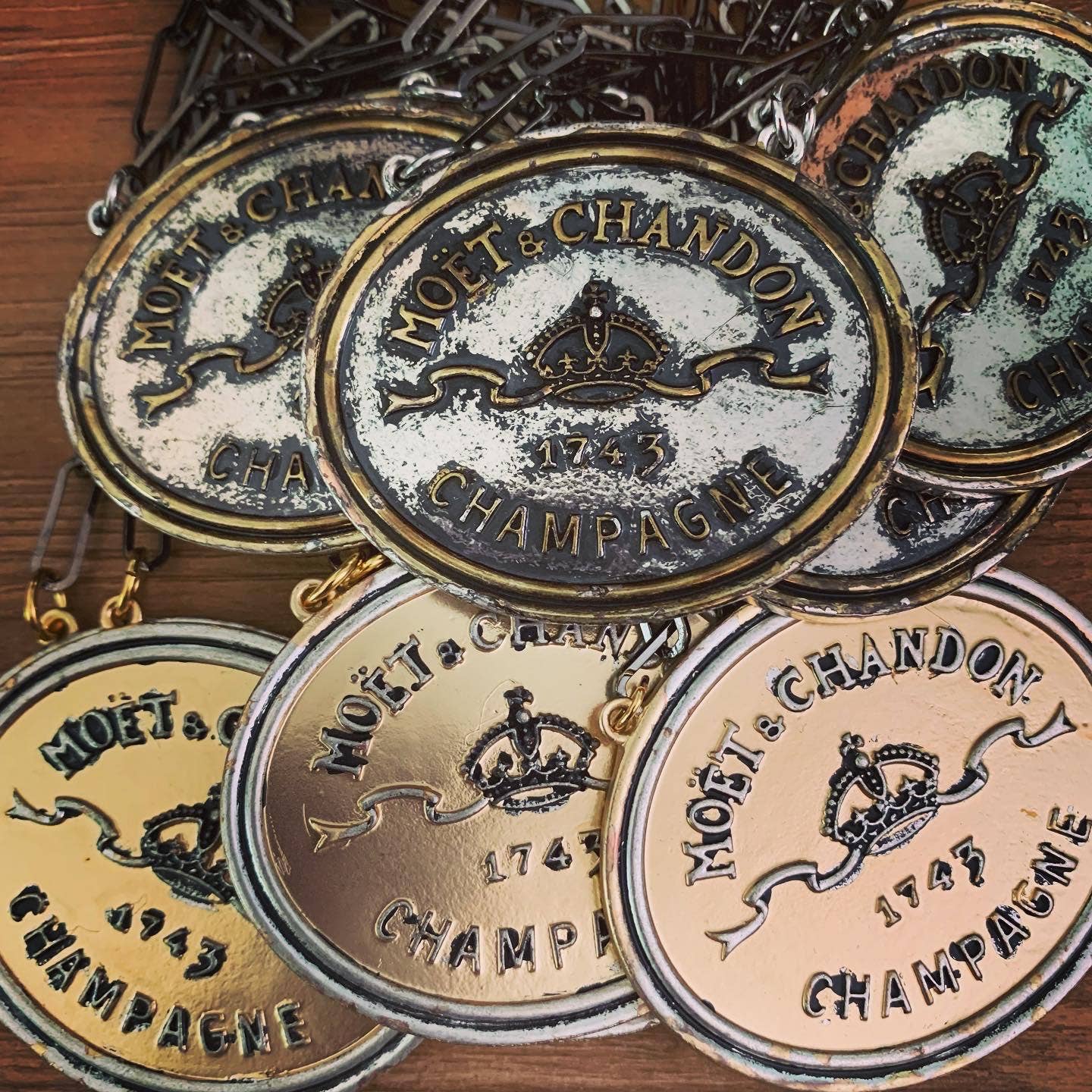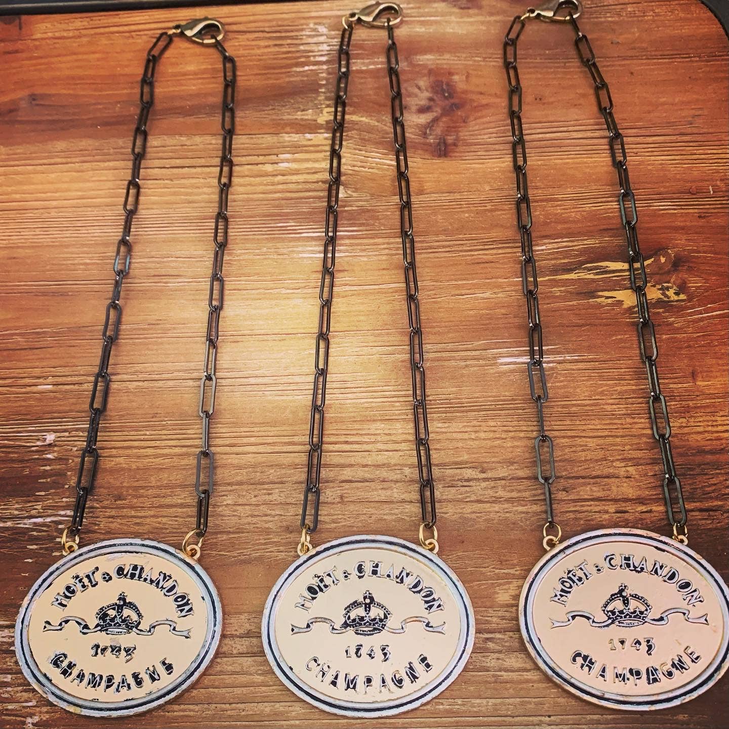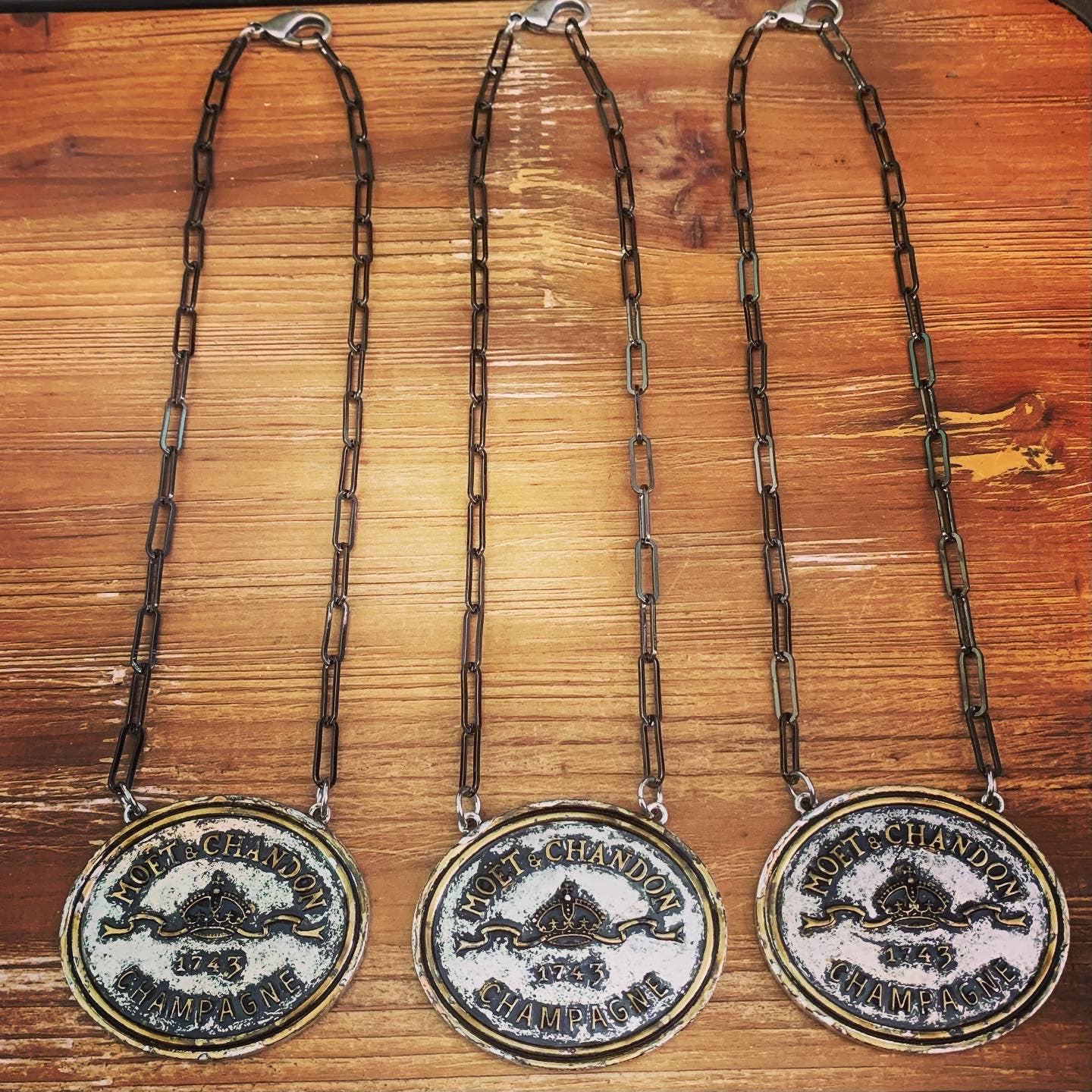 Champagne is a XL, weighty 47mmx57mm medal of the Moët & Chandon label set simply on a 17” medium paperclip chain in a shiny black finish. The open links allow you to close it shorter and it comes in two colors: Matte Gold/Burnished Silver Burnished Silver/Bronze
