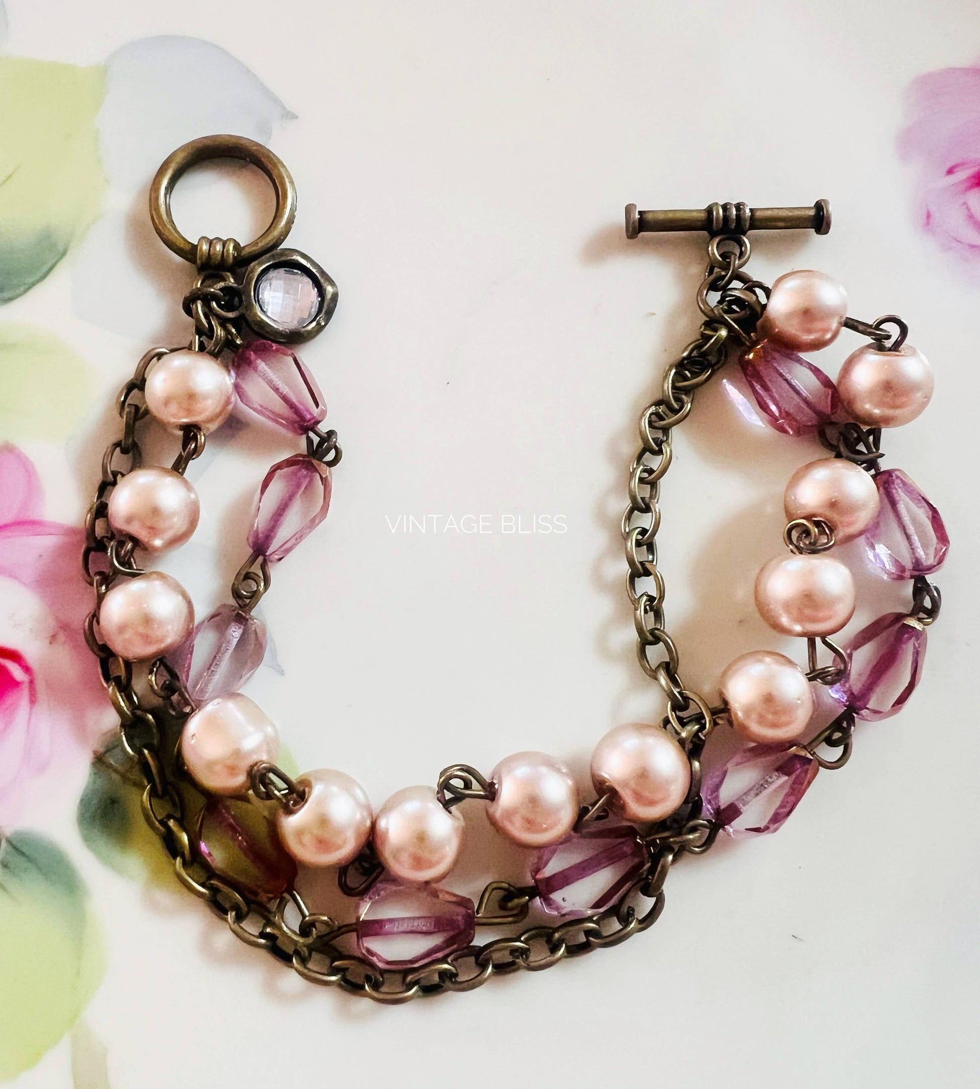 Champagne Pearls Pink Beaded Triple Strand Bracelet