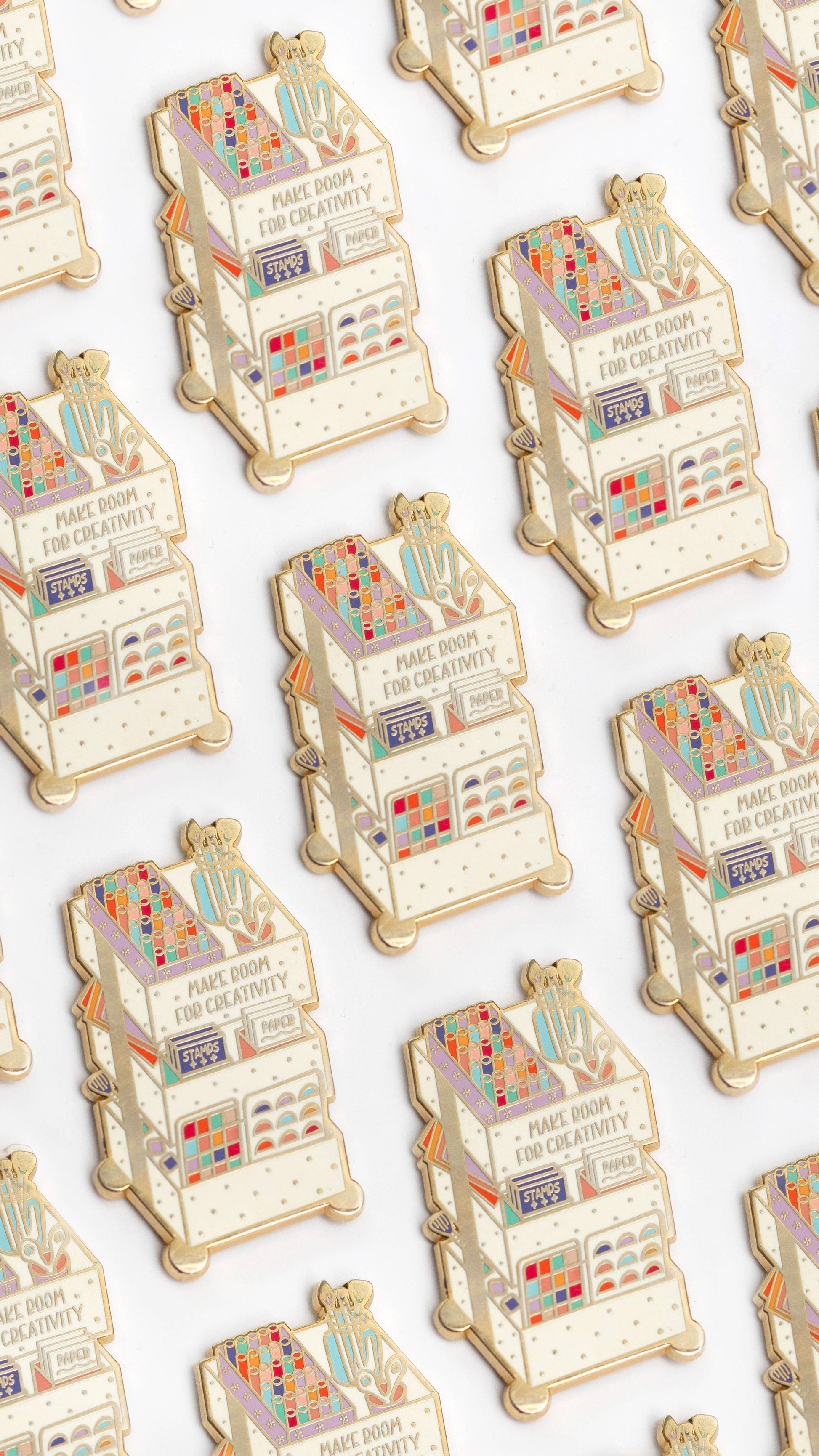 This fun gold and bright enamel pin makes a perfect gift for the amazing crafters and artists in your life. In honor of the Raskog cart that stores your favorite crafting supplies like paper, stamps, Copic markers, and other essentials! It makes for a super stylish gift for loved ones.