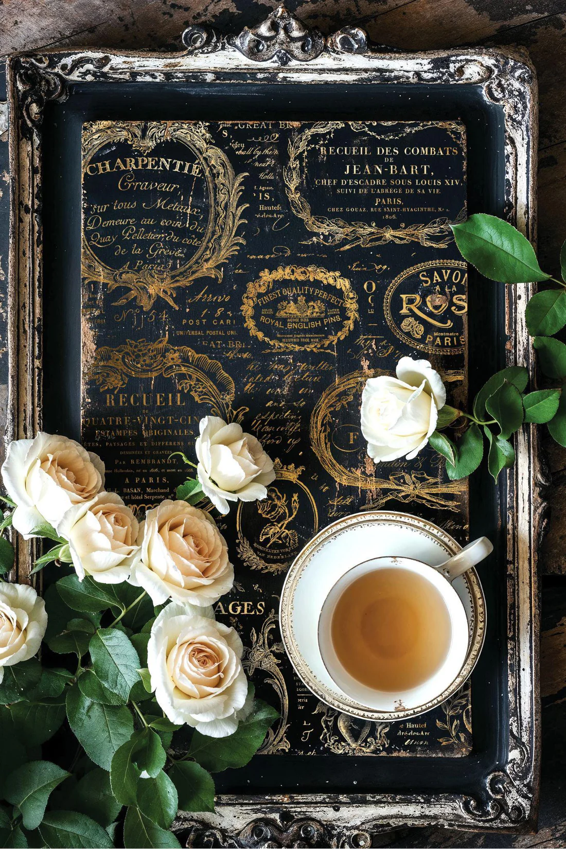 A sophisticated European gilded transfer collection, Étiquettes is perfect for goth-glam styles and seamlessly integrates into French farmhouse aesthetics when used on neutral colors and softened with a patina or slight antiquing. This collection features elegant labels and signage with flourished frames, intricate typography, and motifs reminiscent of 18th and 19th-century decorative art. Laurel wreaths, floral motifs, and frames inspired by 1800s calling cards add to its timeless charm. Use individual elements on your small projects, or apply the whole sheet as an all-over pattern.