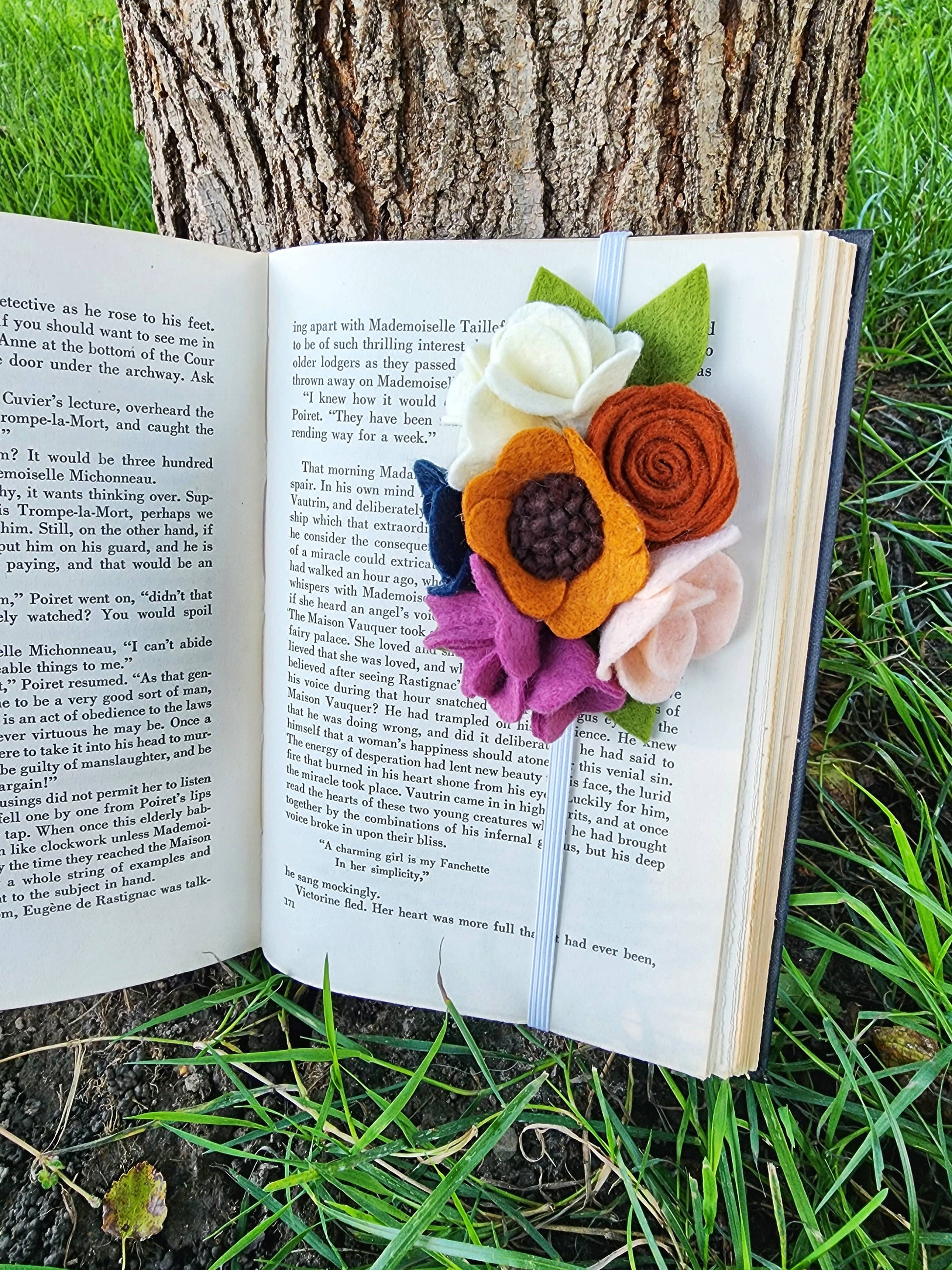 These bookmarks make the perfect gift for any avid reader! Each bookmark is embellished with handmade wool felt flowers secured on an elastic band to fit almost any size book.