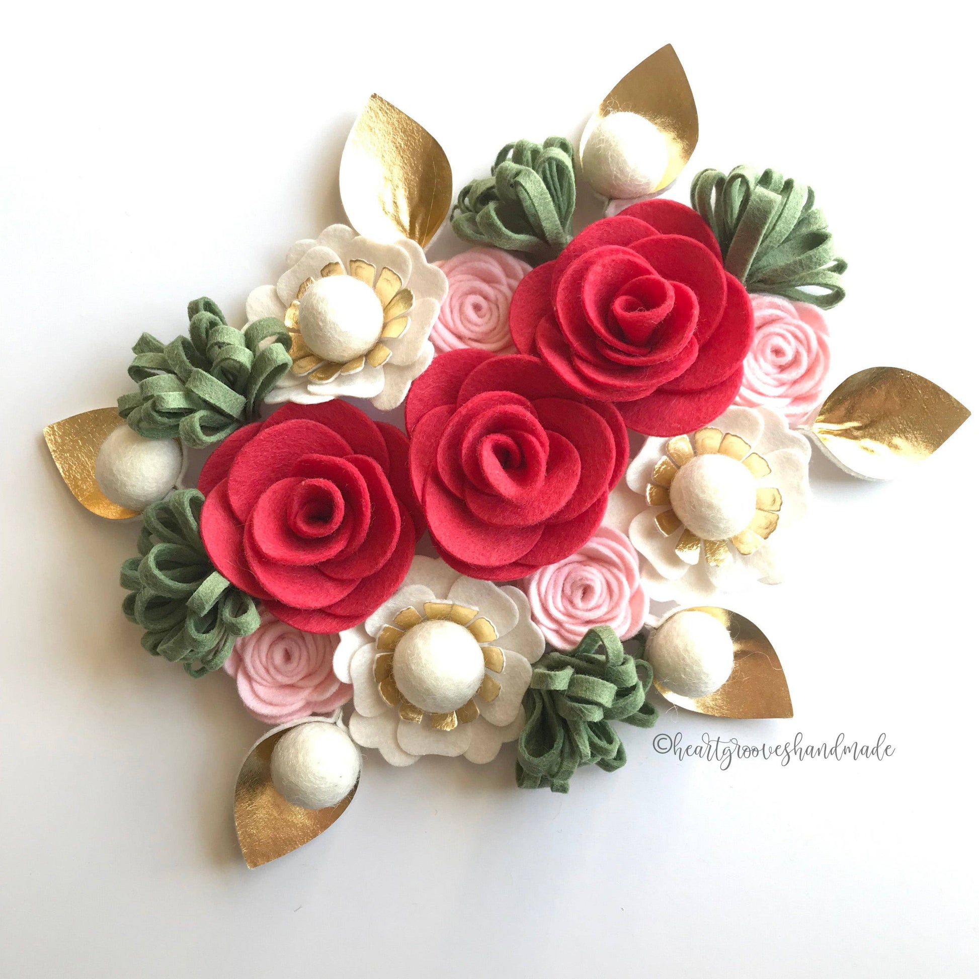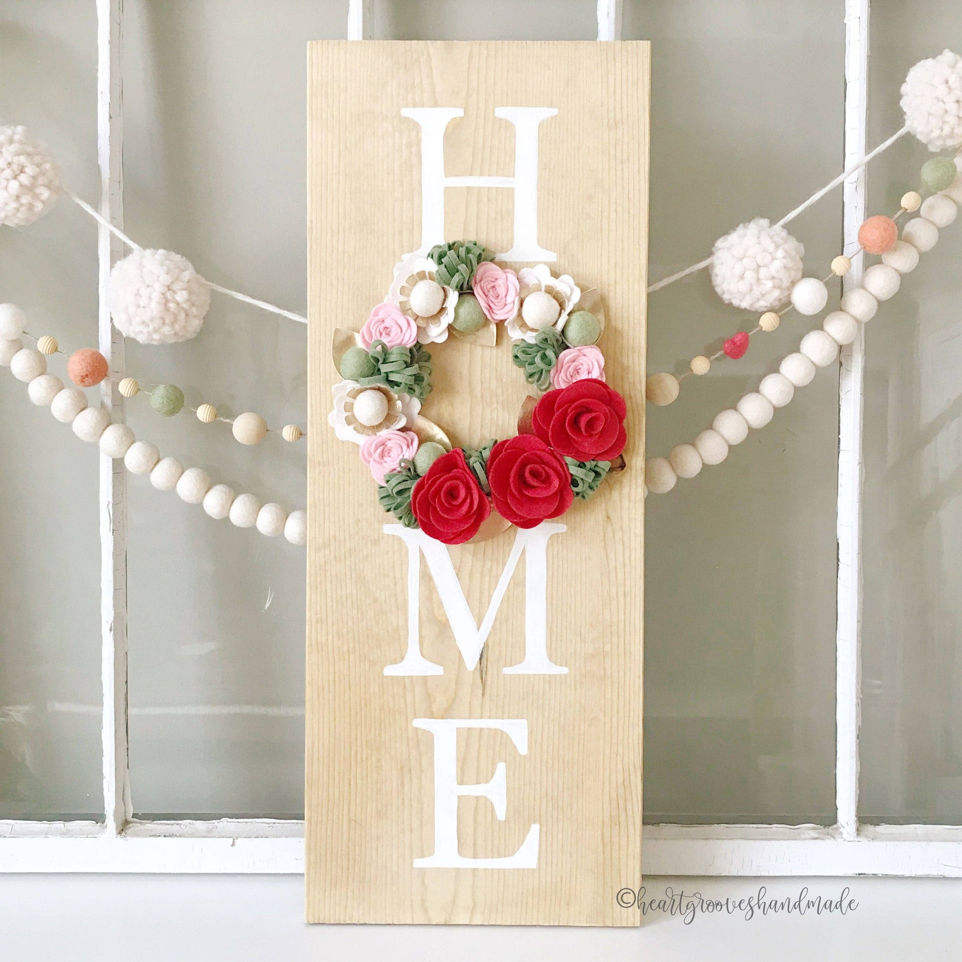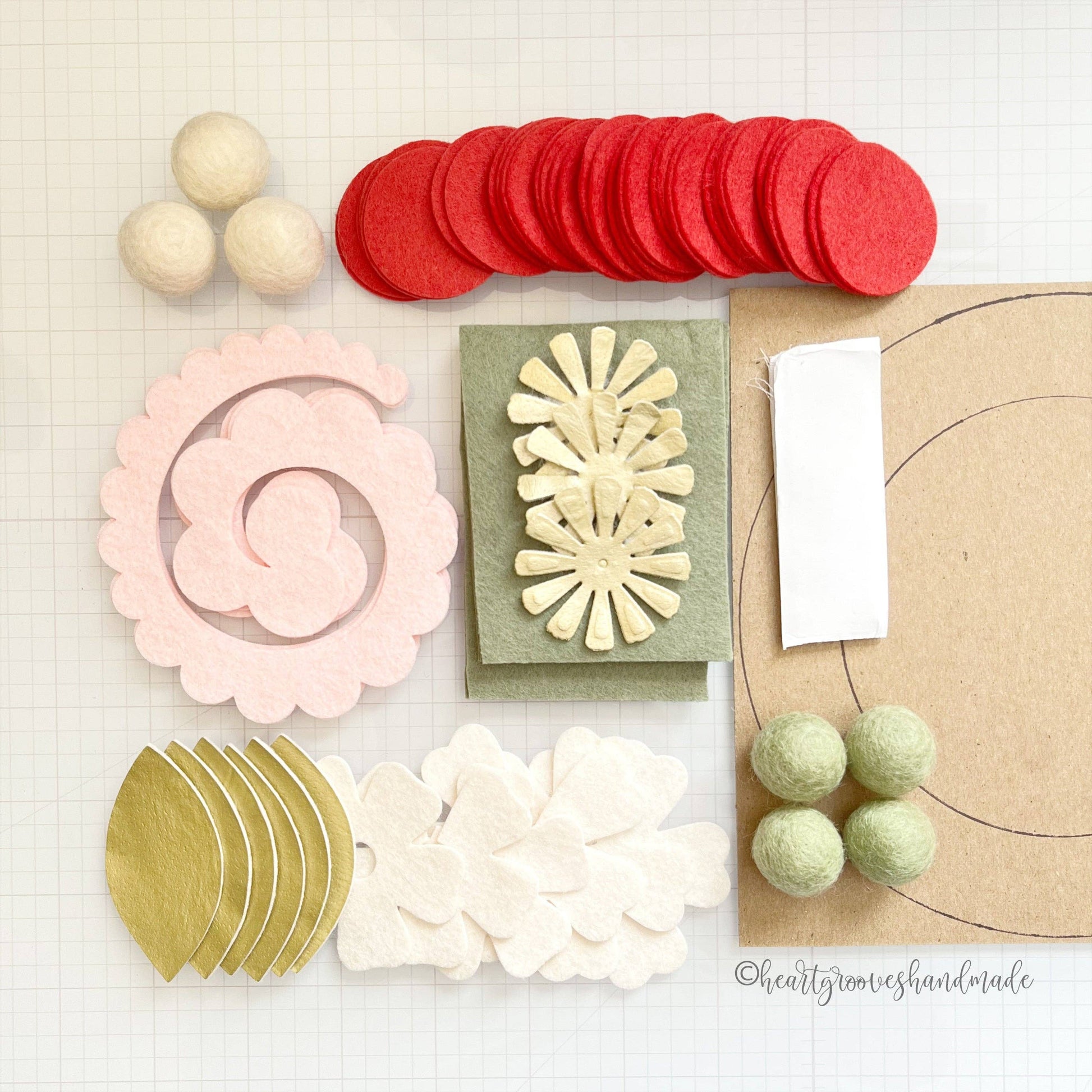 A felt craft kit designed by Beth for Heartgrooves Handmade for making a beautiful 7-inch felt flower wreath on your own. This kit provides all the felt pieces to make 3 roses, 3 poppies, 6 small mums, 4 mini roses, 2 leaves, and 4 berries with dimensional leaves. Included is a cardstock base template that can be hung on a wall with velcro or attached to a project if desired. This wreath is designed to be interchangeable with the other Heartgrooves Handmade Wreath Craft Kits on your home decor projects so the wreaths can be changed easily. The completed flowers can also be used for any type of project, the sky is the limit! High-quality wool blend felt is pre-cut and organized to make crafting these flowers easy and stress-free.
