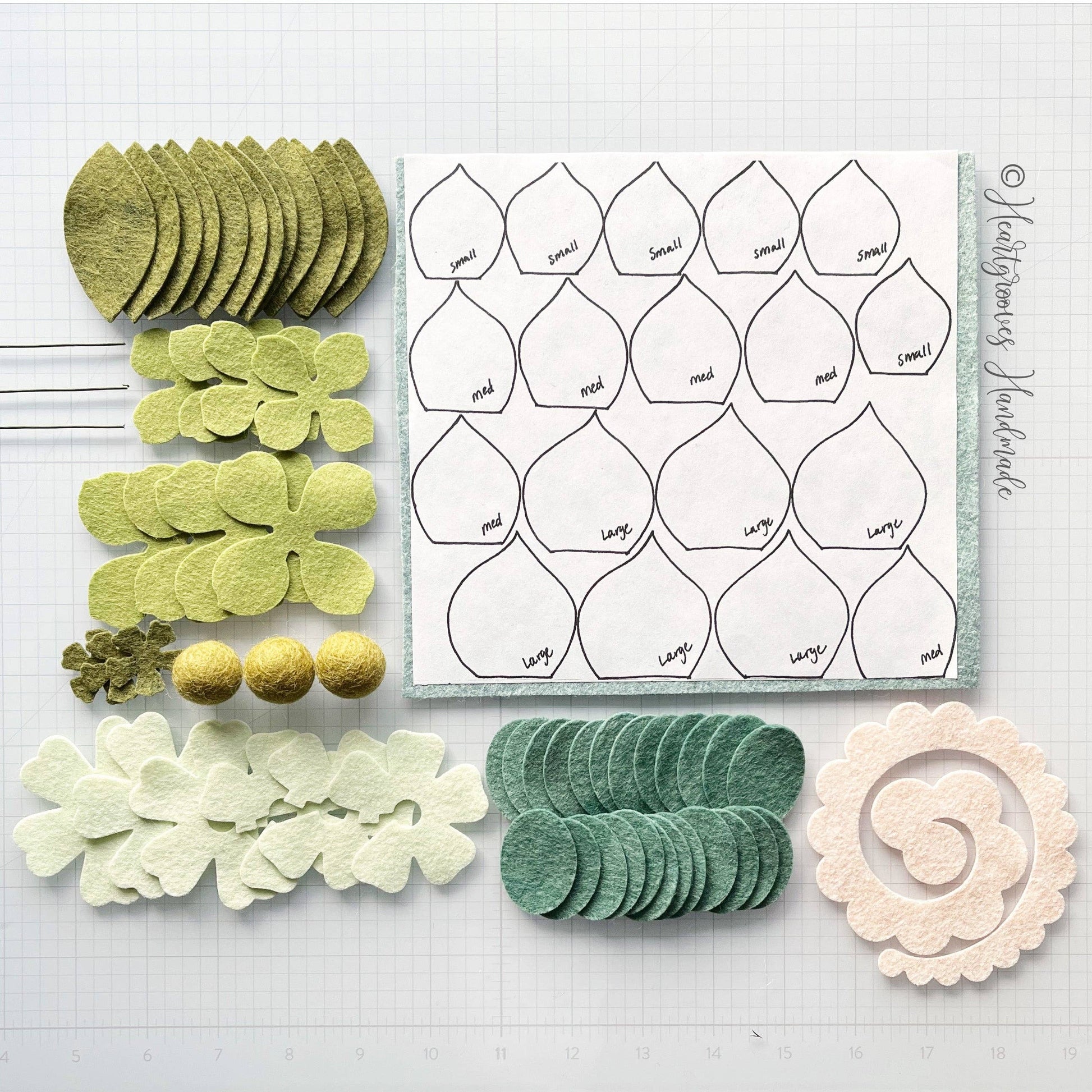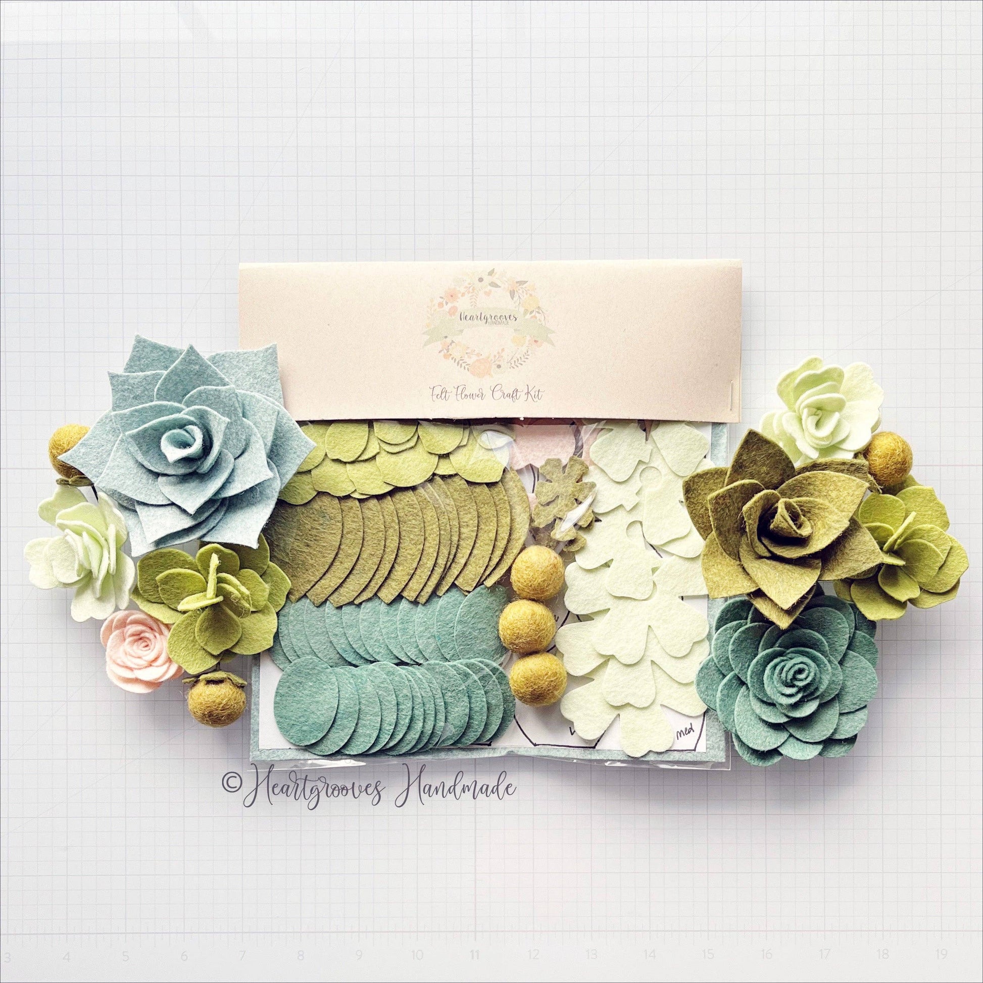 A felt craft kit designed by Beth for Heartgrooves Handmade for making beautiful felt succulents on your own. The high-quality wool blend felt pieces are cut and organized for you to have a fun and stress-free crafting experience. The kit includes a link to download written step-by-step instructions. All you will need is a hot glue gun and sharp scissors for minimal cutting to complete the flowers. There are supplies to make 3 large succulents (with an alternative option to make 2 smaller flowers instead of a large flower) along with additional smaller accent flowers and buds. When completed, the 3 main flowers are approximately 3-5" in diameter.