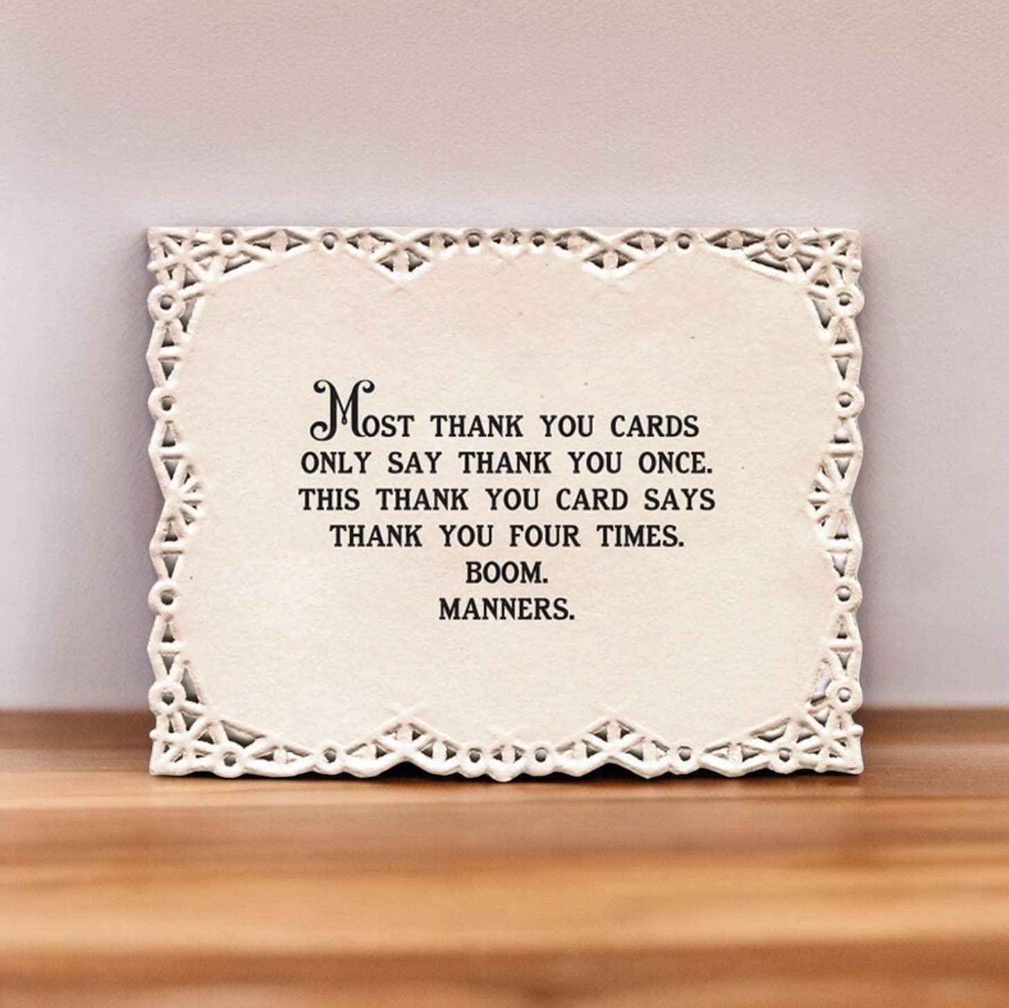 Be an overachiever and send this vintage-inspired thank you card: "Most thank you cards only say thank you once. This thank you card says thank you four times. Boom. Manners."