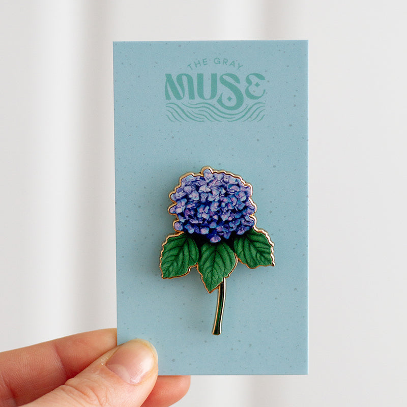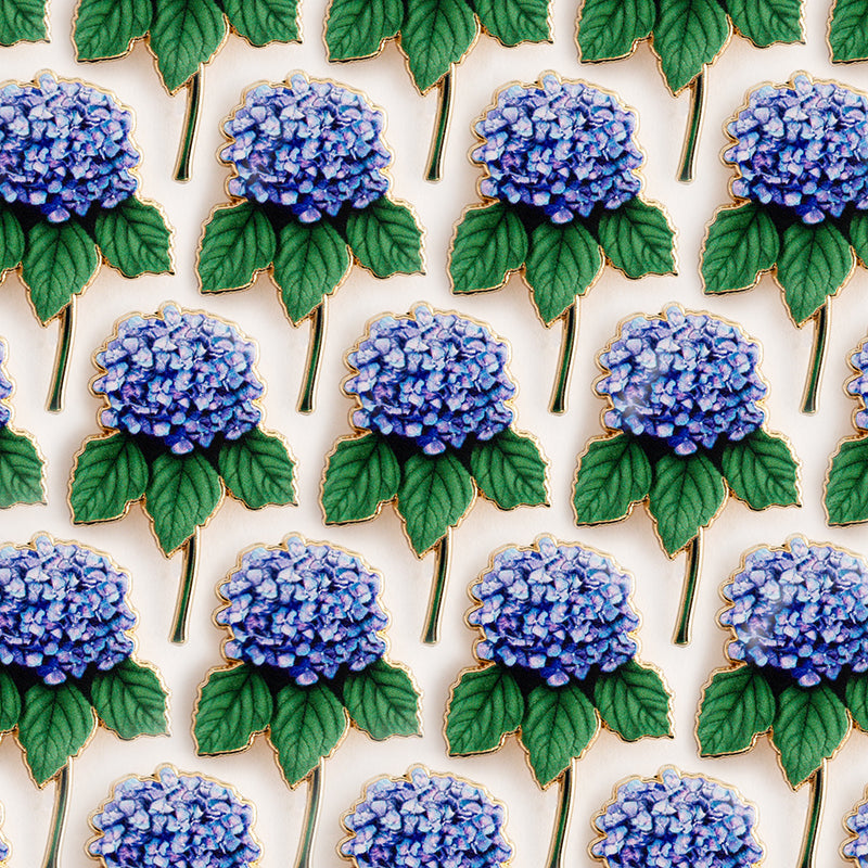 – Detailed UV printed enamel pin showcasing a stunning Hydrangea floral design