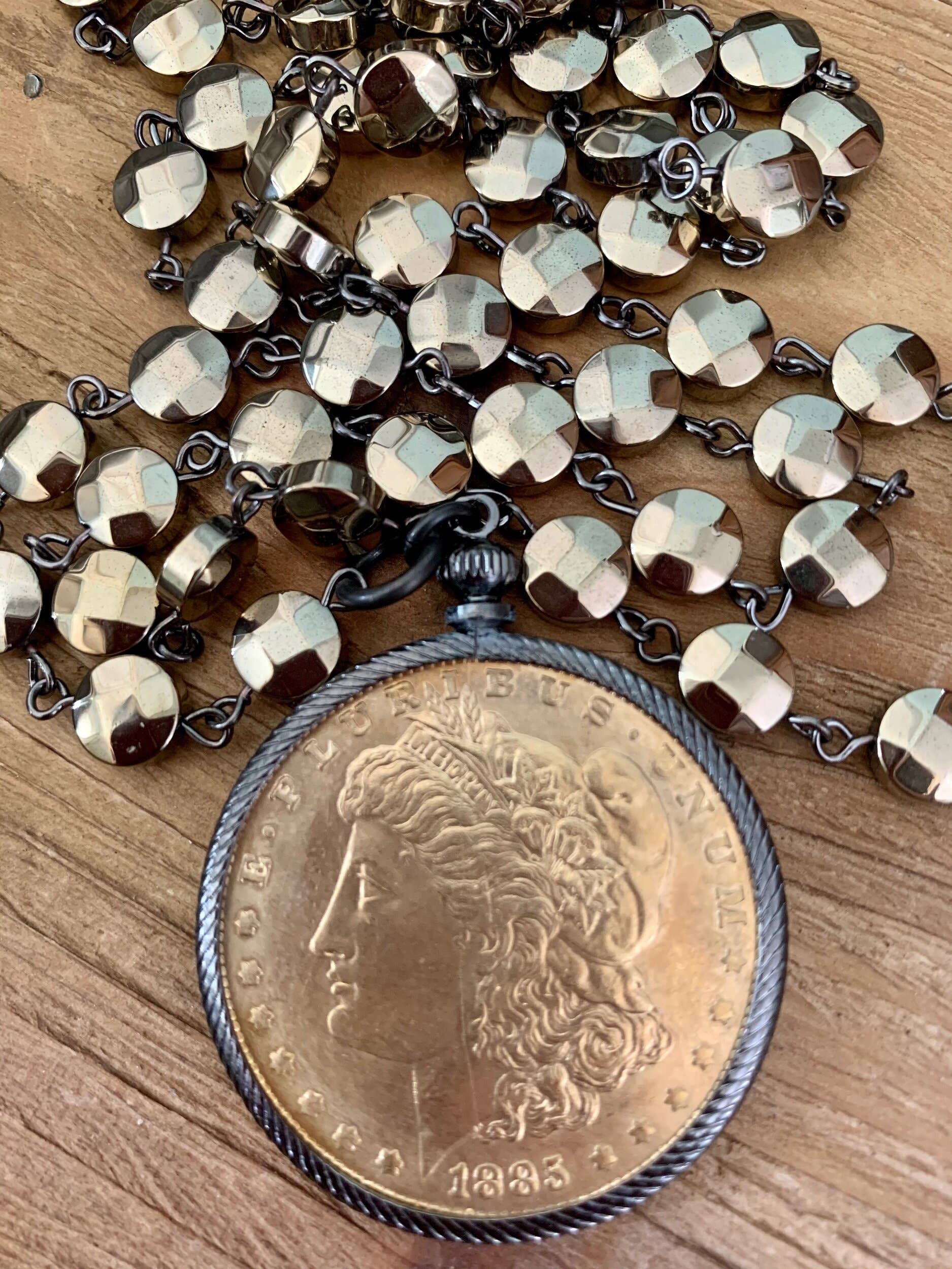 Gold coin only comes on titanium coated faceted hematite chain in brass bezel. All chains are 31-32 inches long.