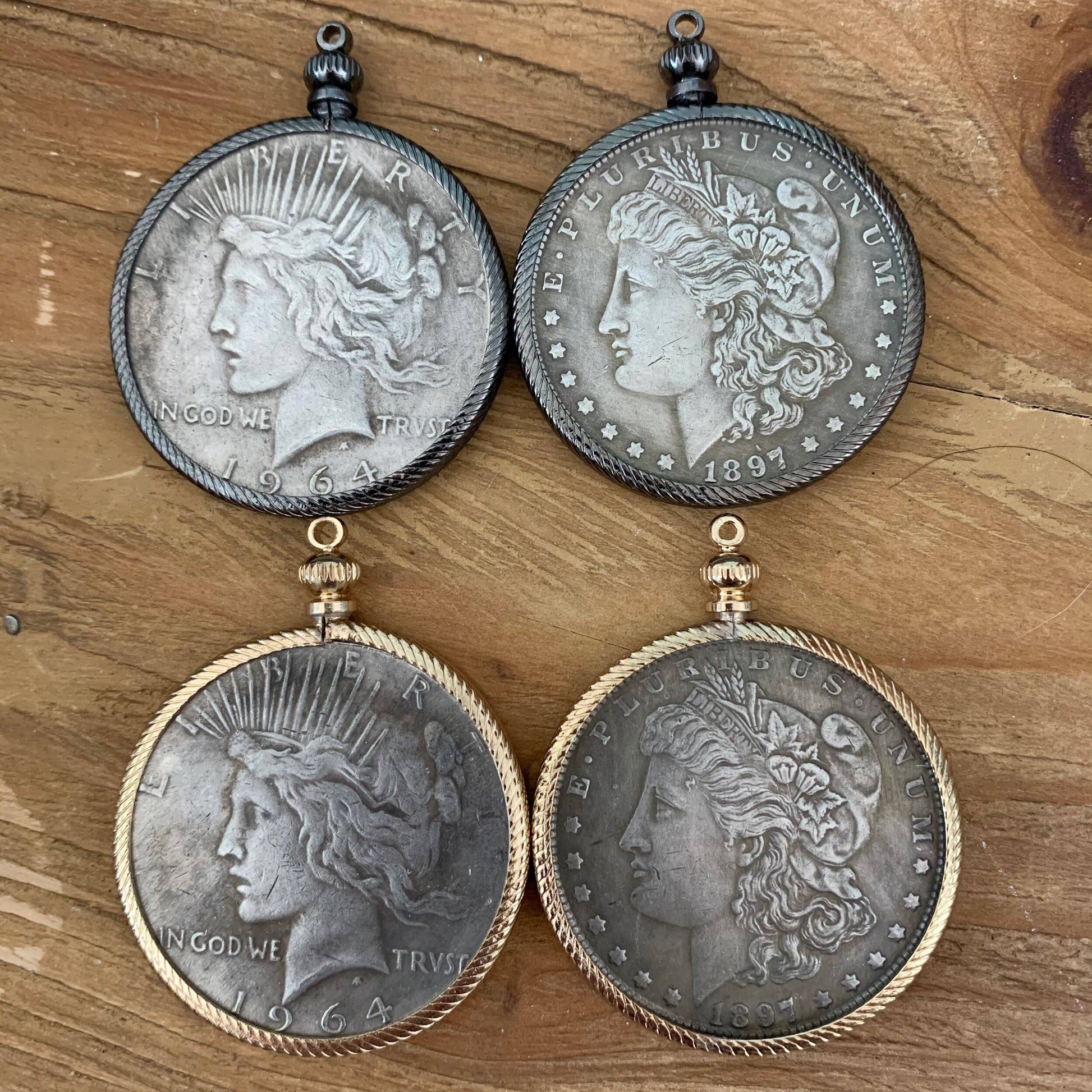 This is a gorgeous, and heavy, pewter reproduction of a Liberty Coin that is 1.5 inches in diameter. Choice of shiny black or matte gold chain and 2 different profiles, crown or floral wreath.
