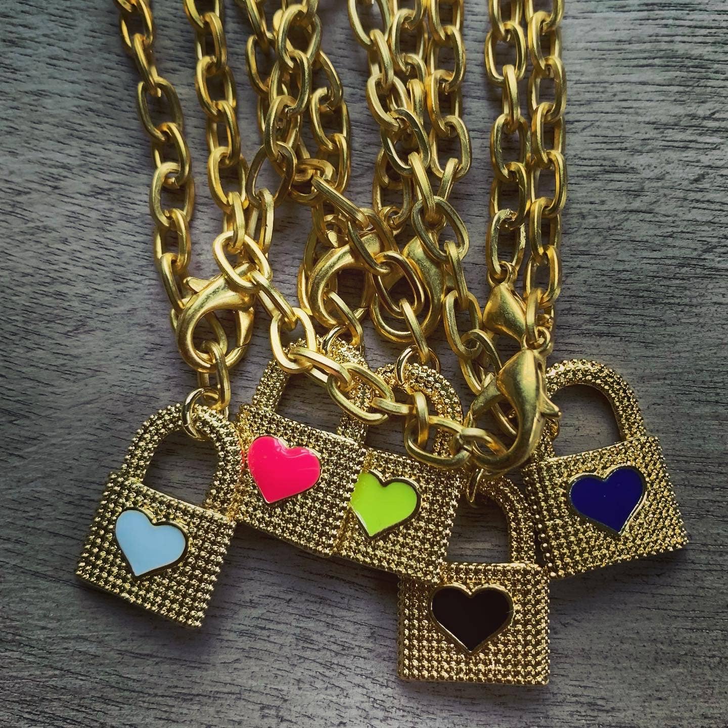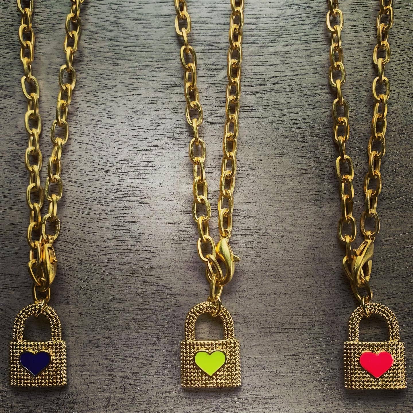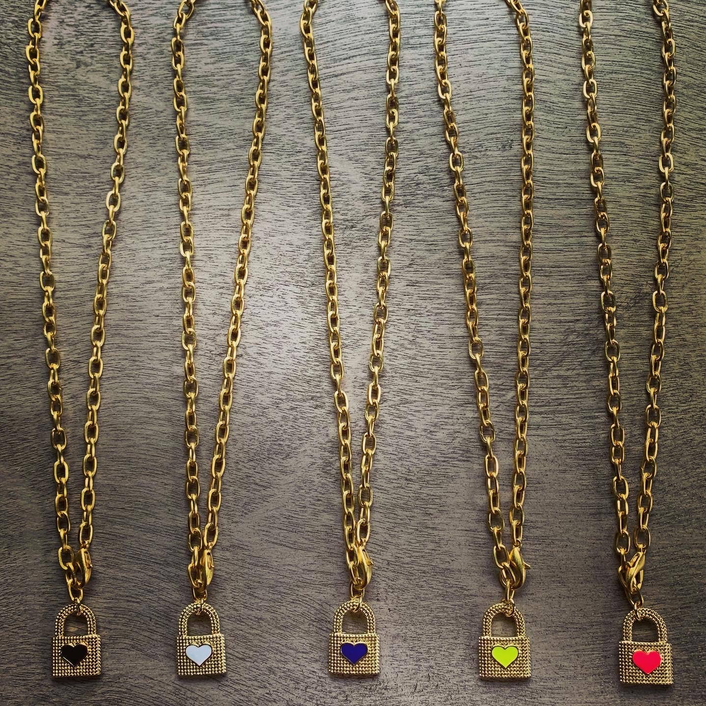 Lock Down features the cutest textured padlocks with enamel hearts all on a small matte oval link chain with a front clasp that is 17 inches long.