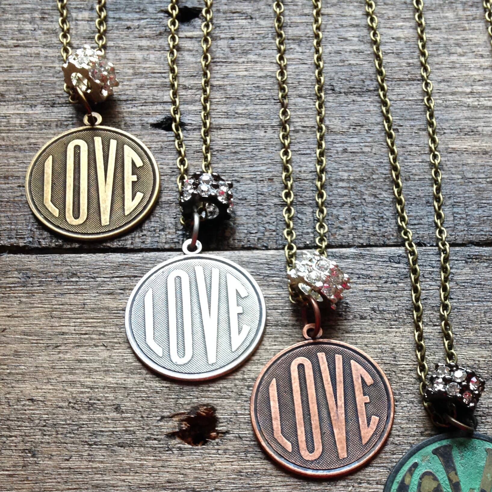 18 inch antiqued brass chain with Swarovski wheel and 26mm love charm. Charm available in brass, copper, verdigris or silver.