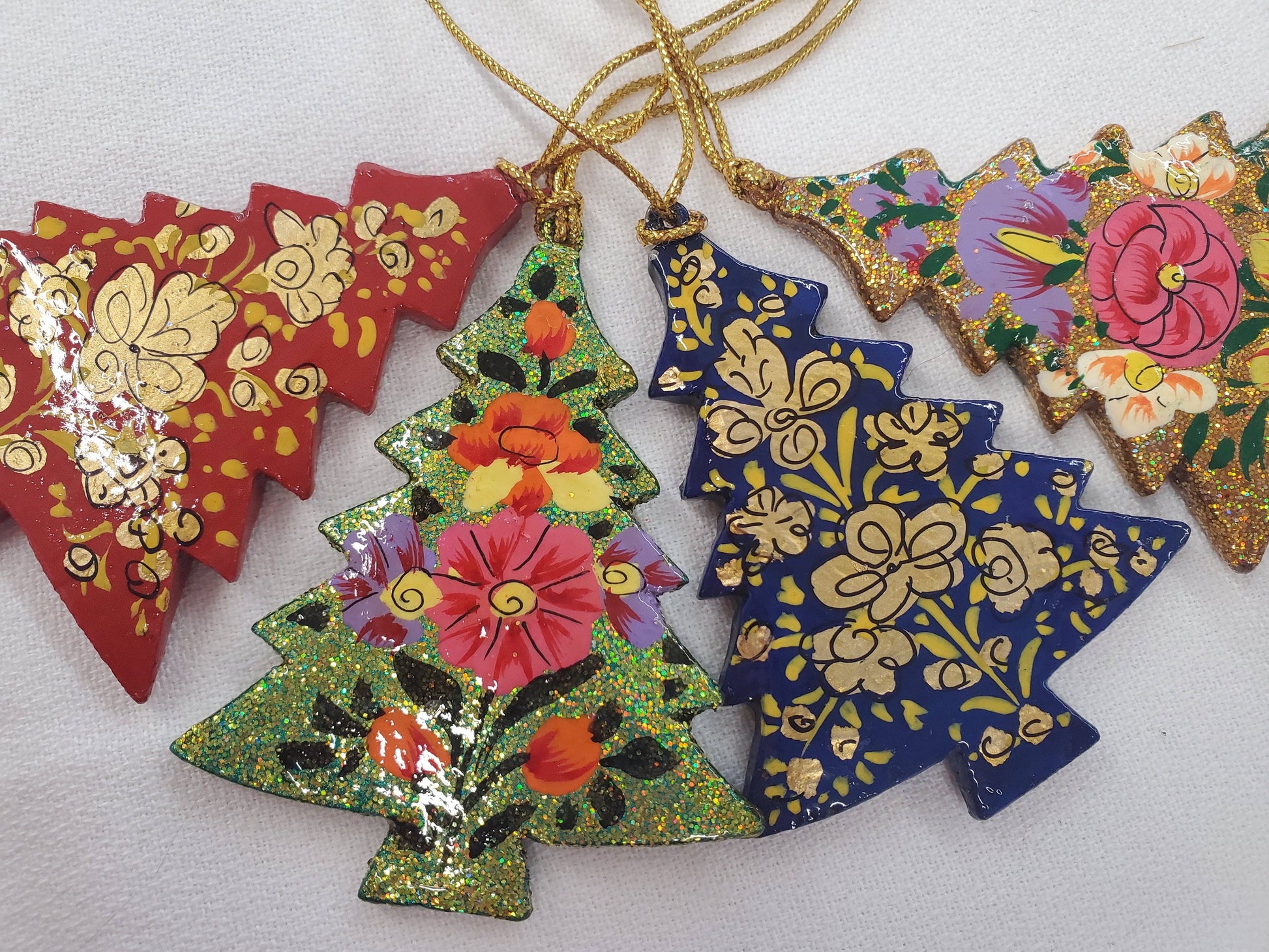 Measuring approx 3" high and 2.5" wide these flat papier mache ornaments are hand painted in Kashmir. Available in a variety of colors. Hand painted on both sides.