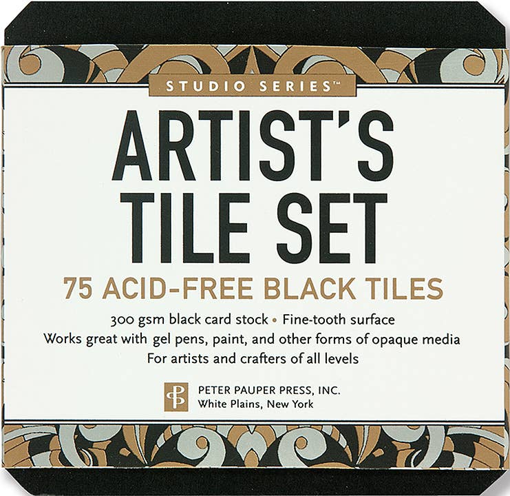 Calling all artists and crafters! Create dramatic drawings and designs in gel pen, paint, pastel, and more, with high quality black tiles. Set of 75 black Artist's Tiles. 300 gsm card stock. Fine-tooth surface takes pigment pen and other artist tools beautifully. No ink bleed for fine line control. Card set is acid-free and of archival quality. Good for dry and wet media. For artists and crafters of all levels. Tiles measure 3-1/2'' square. Keep a set with you for creative expression on the go!