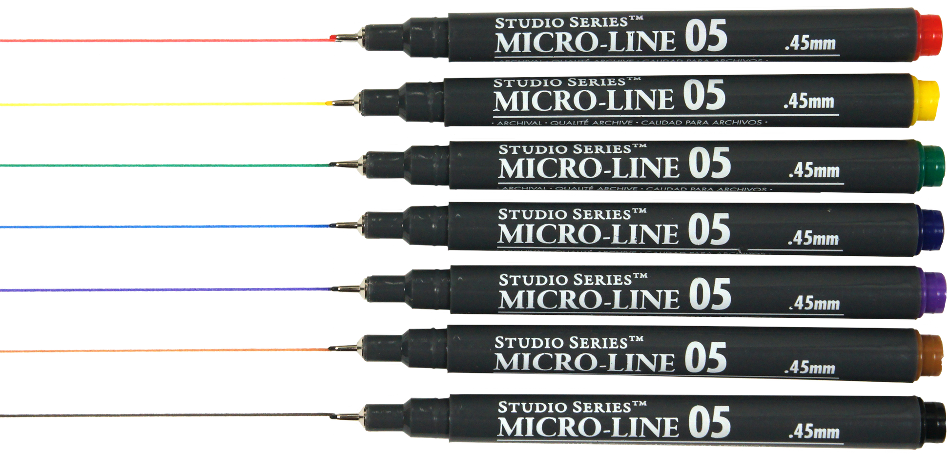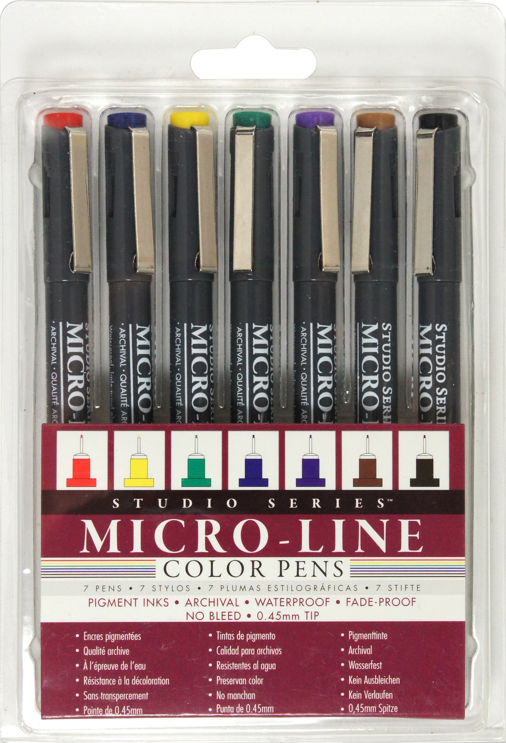 Perfect for drawing, writing, illustration, crafting, technical work, and more, this high-quality pen set includes 7 micro-line pens in 7 bold hues. Studio Series Micro-Line Color Pen Set includes pens in black, red, blue, green, purple, brown, and yellow. Precise .05 (.45mm) tips. Micro-pigmented inks create fine, consistent, fluid lines. Archival-quality pigment-based ink. Waterproof. Fade-proof. No bleed-through. Reusable transparent storage case keeps pens organized and safe on the go. Storage case measures 4-3/4'' wide x 7'' high.