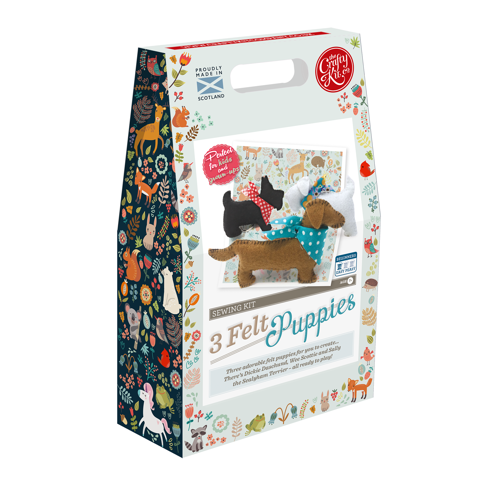 Create 3 gorgeous little dogs! The Crafty Kit Company's 3 Felt Puppies Sewing Craft Kit contains everything you need to make a Scottie dog, a Sausage dog, and Sealyham terrier, plus components to make them into one keyring and 2 brooches.