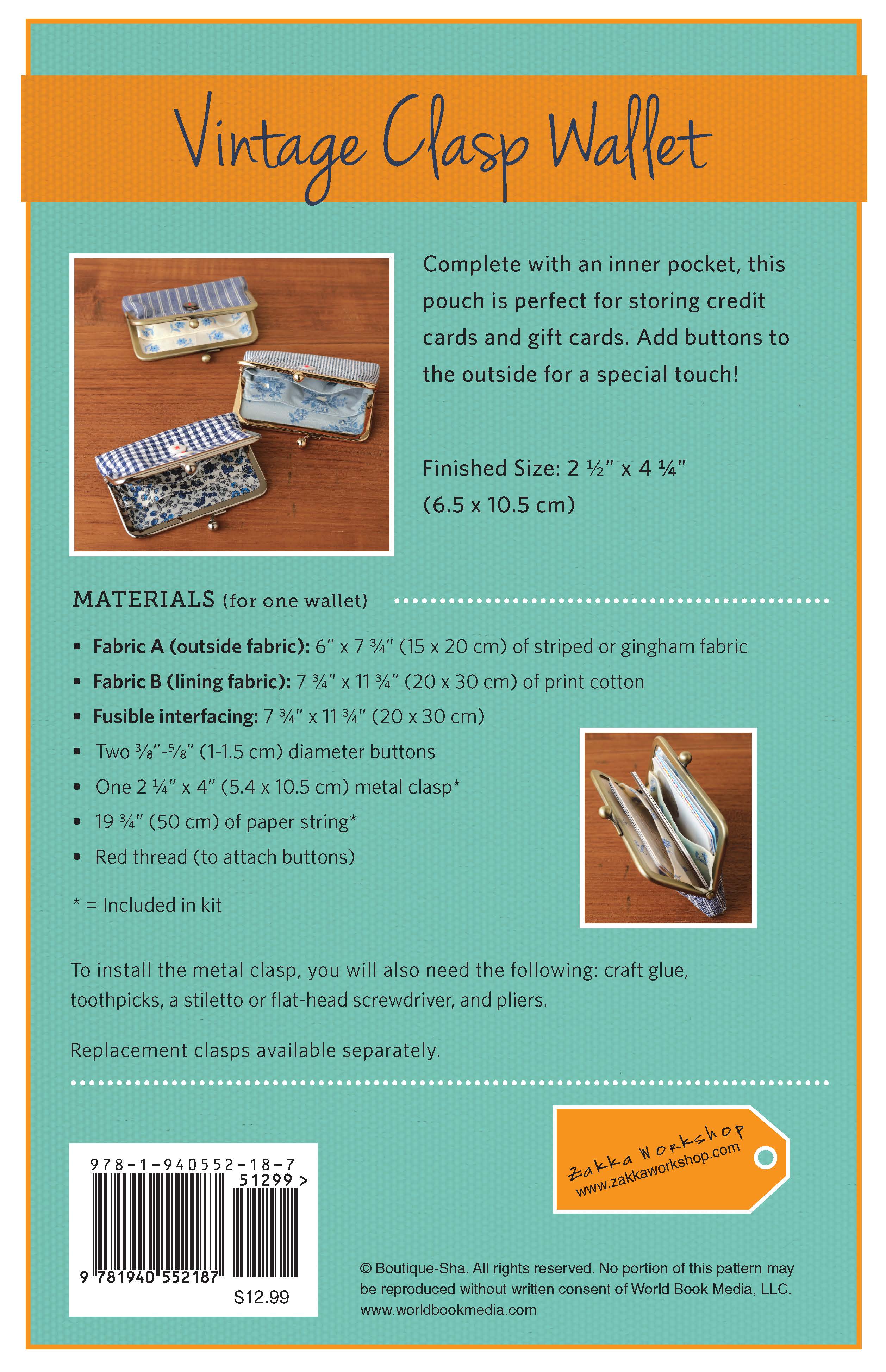 Kit includes: pattern, silver metal purse clasp, and paper string for installation.