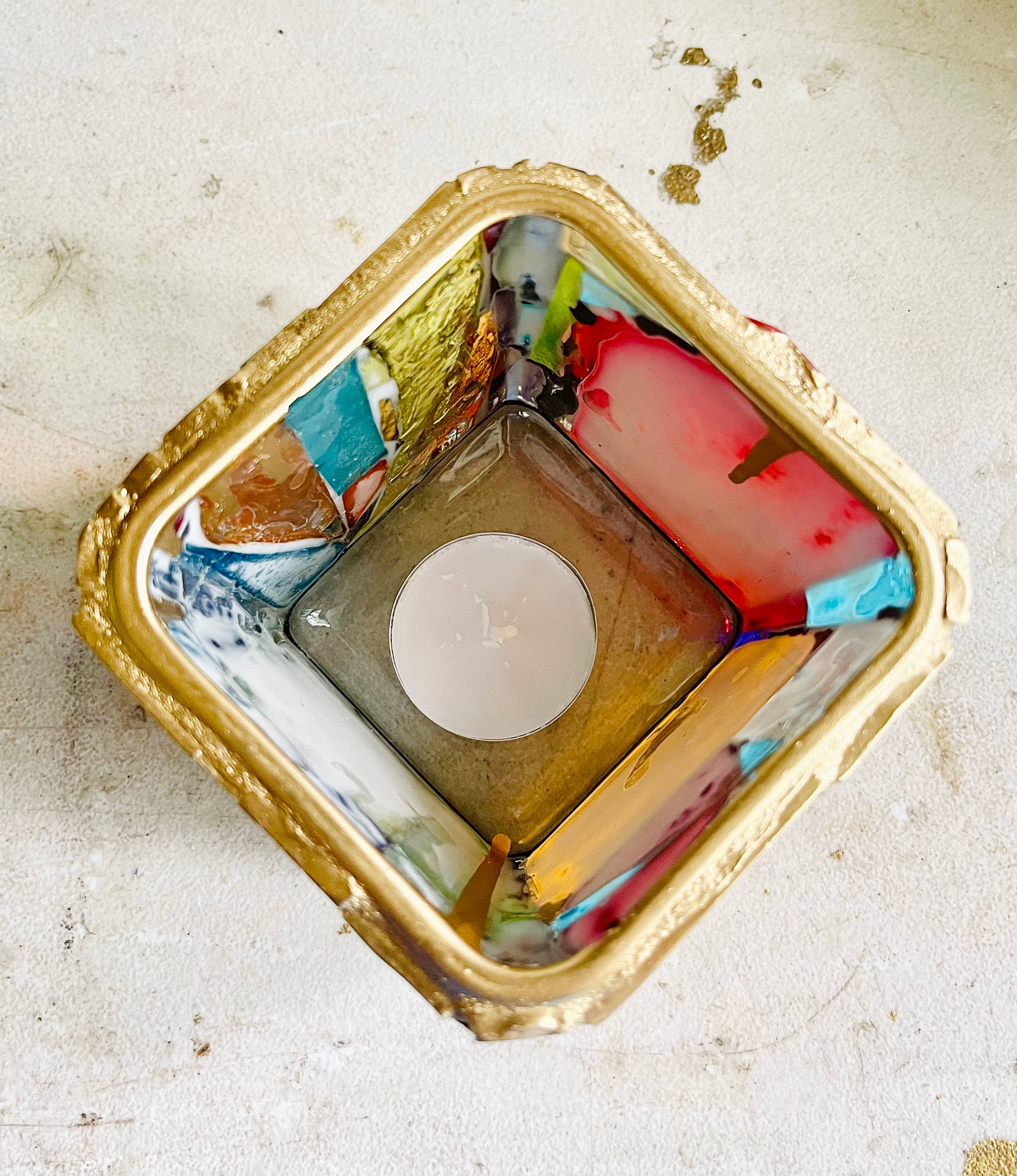 Hand-cut glass mosaic with gold painted accents. Handmade.